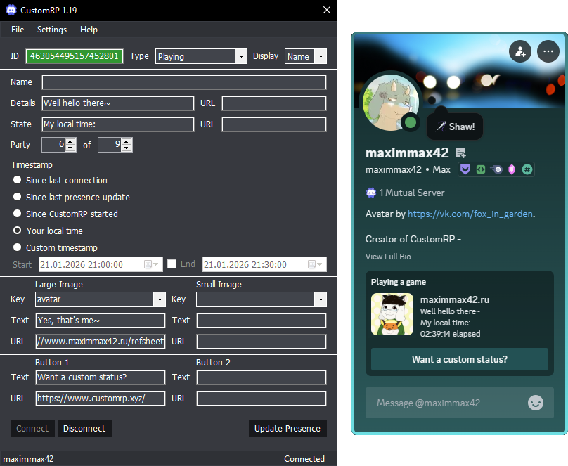 Download the latest version from the Releases page and run the .exe installer! You can also use Windows Package Manager to install the program (winget install maximmax42.CustomRP) or, if you prefer the portable version, download the zip, unpack it somewhere, preferably in a separate folder, and start it up. Upon starting, you will be prompted to open a setup manual. You can open it later by pressing F1 or going to Help -> Open Manual.
