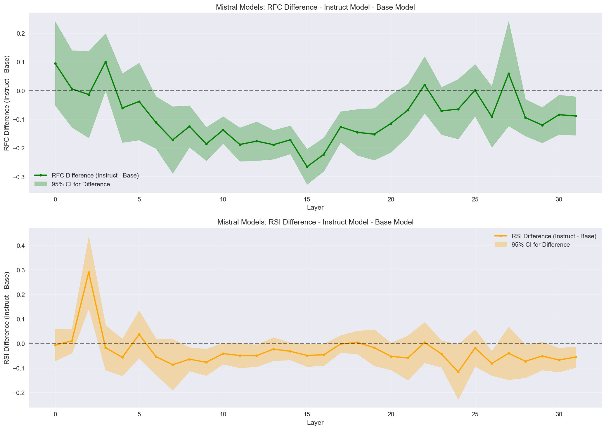 Statistical comparison of RFC and RSI differences between base and instruct models with 95% confidence intervals. RFC in base model middle layers is >> 0, whereas instruct models ~= 0, showing much more focused attention on self-reference in base vs instruct models. A potentially useful dashboard metric for fine-tuning effectiveness, tracking the alignment of fact-based treatment with self-oriented prompts.