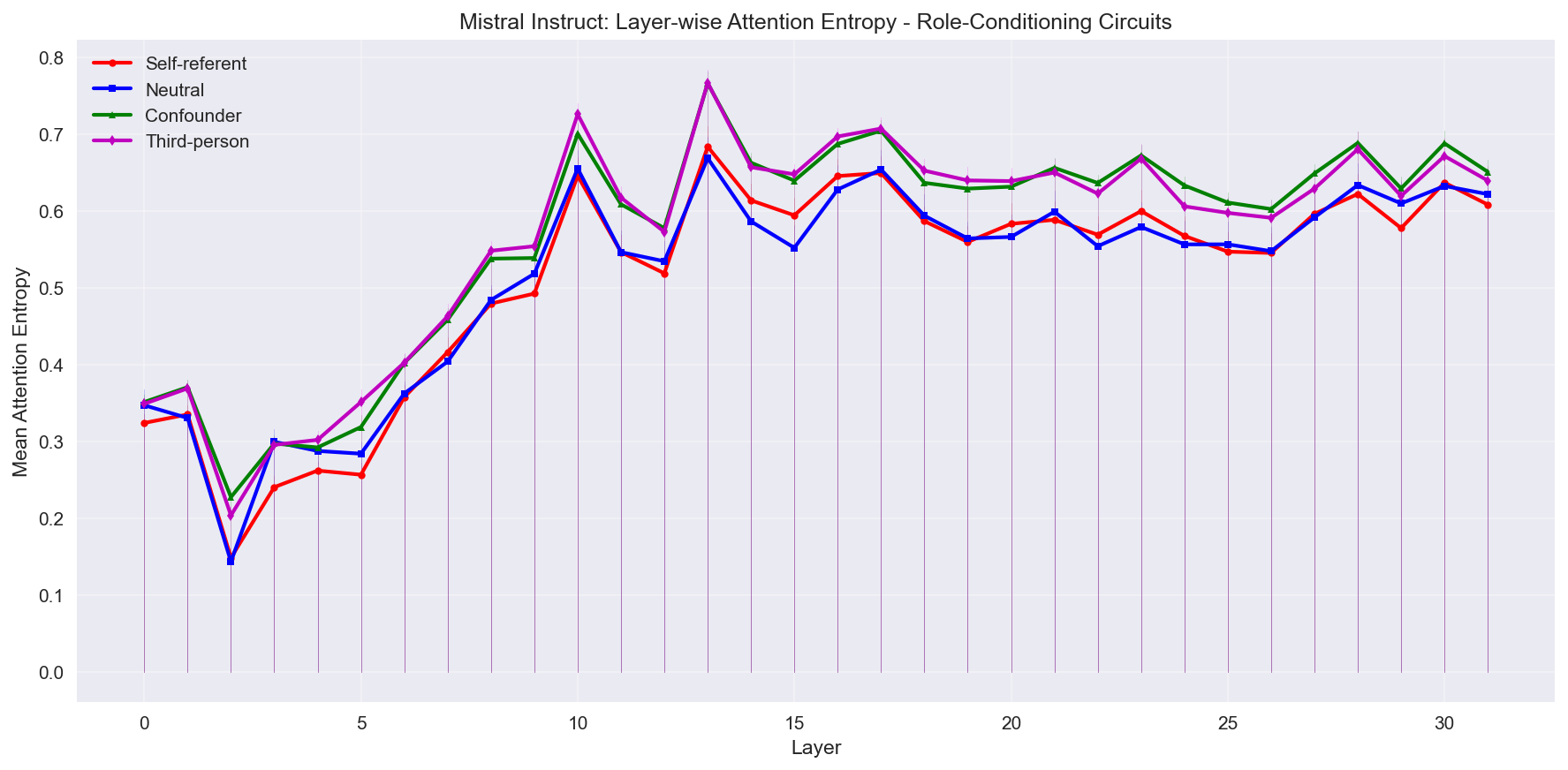 Shows attention entropy progression across all 32 layers with 95% confidence intervals. Self-referent prompts (red) and neutral (blue) consistently show lower entropy (more focused attention) compared to confounder (green) prompts and third person (magenta) prompts.