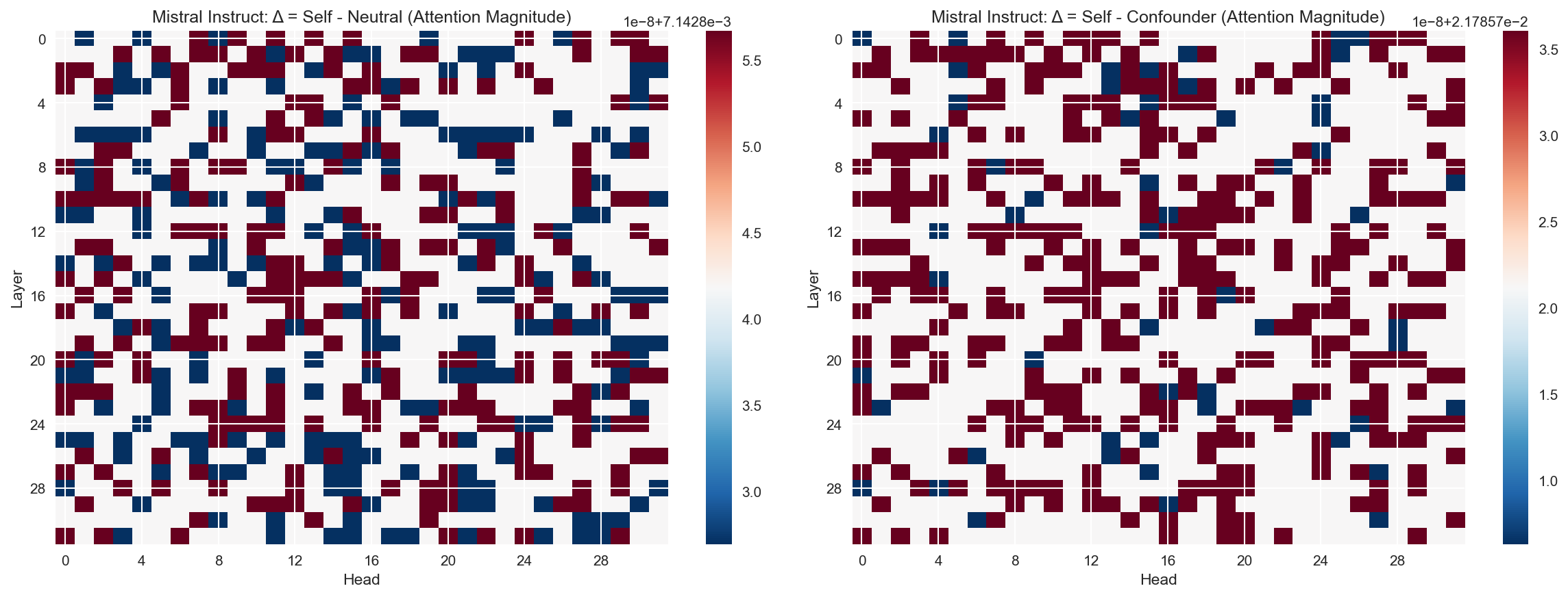 Identifies specific attention heads that are most sensitive to role-conditioning. Red regions indicate heads where self-referent prompts show different attention patterns compared to neutral/confounder prompts.