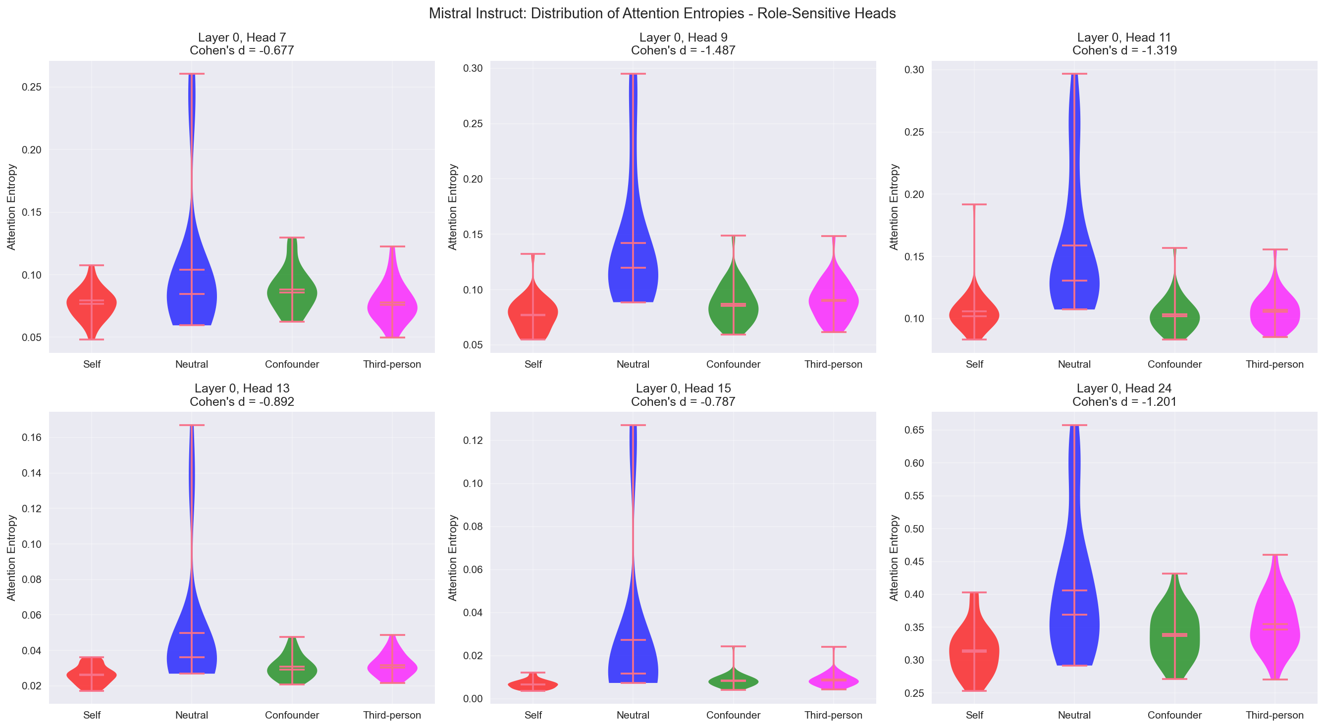 Violin plots showing attention entropy distributions for the most role-sensitive heads across all four categories. Large negative Cohen's d values indicate self-referent prompts produce more focused attention patterns compared to confounder and third-person prompts. But at these particular heads, neutral is most diffuse. Indicates these heads might be "role-orientation" nodes.