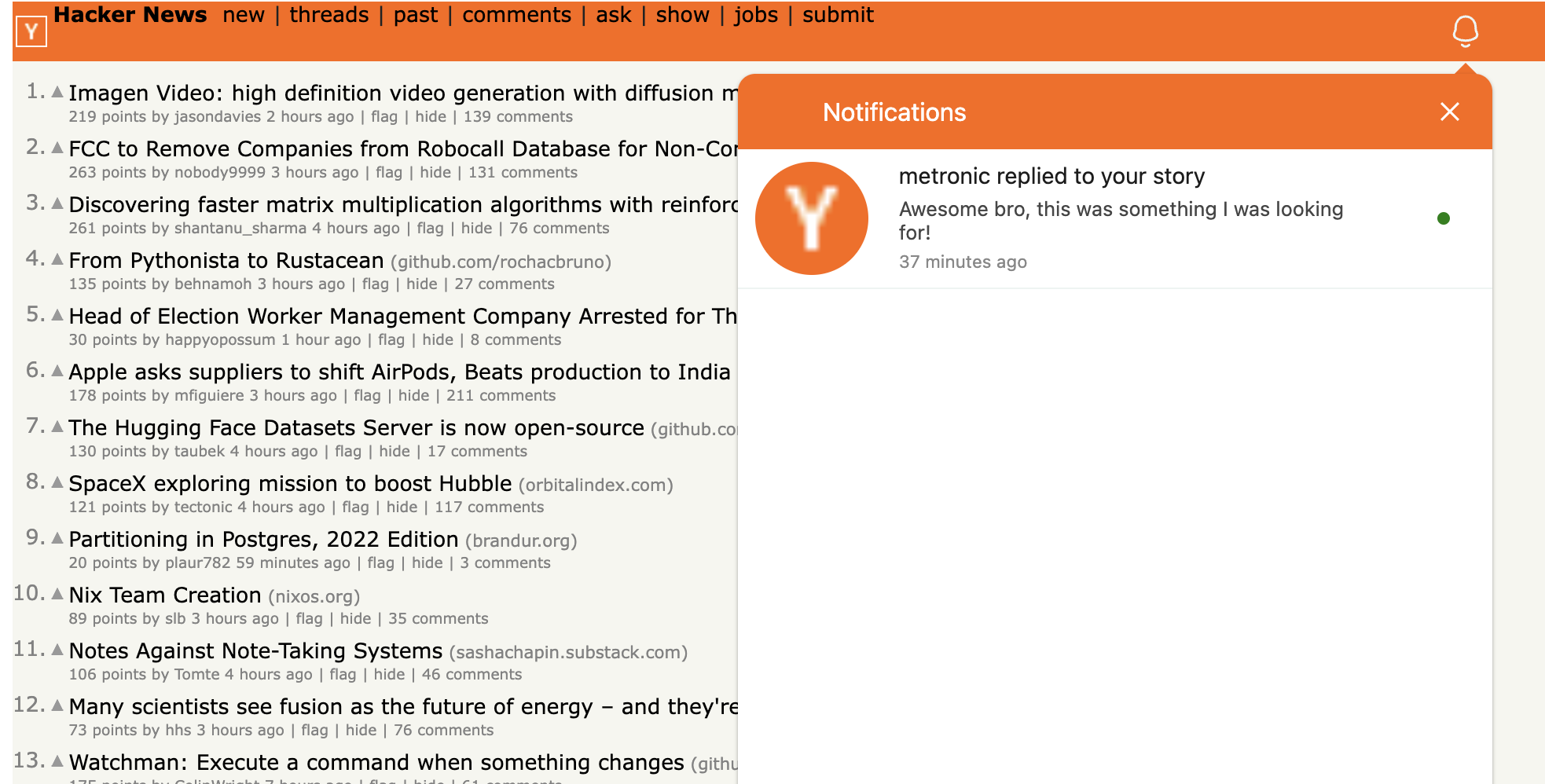 This extension adds an in-app inbox feed to your HackerNews app, just like the one you have in Reddit. Whenever you visit Hackernews, you can simply click on the bell icon to see unread notifications about replied, comments etc!