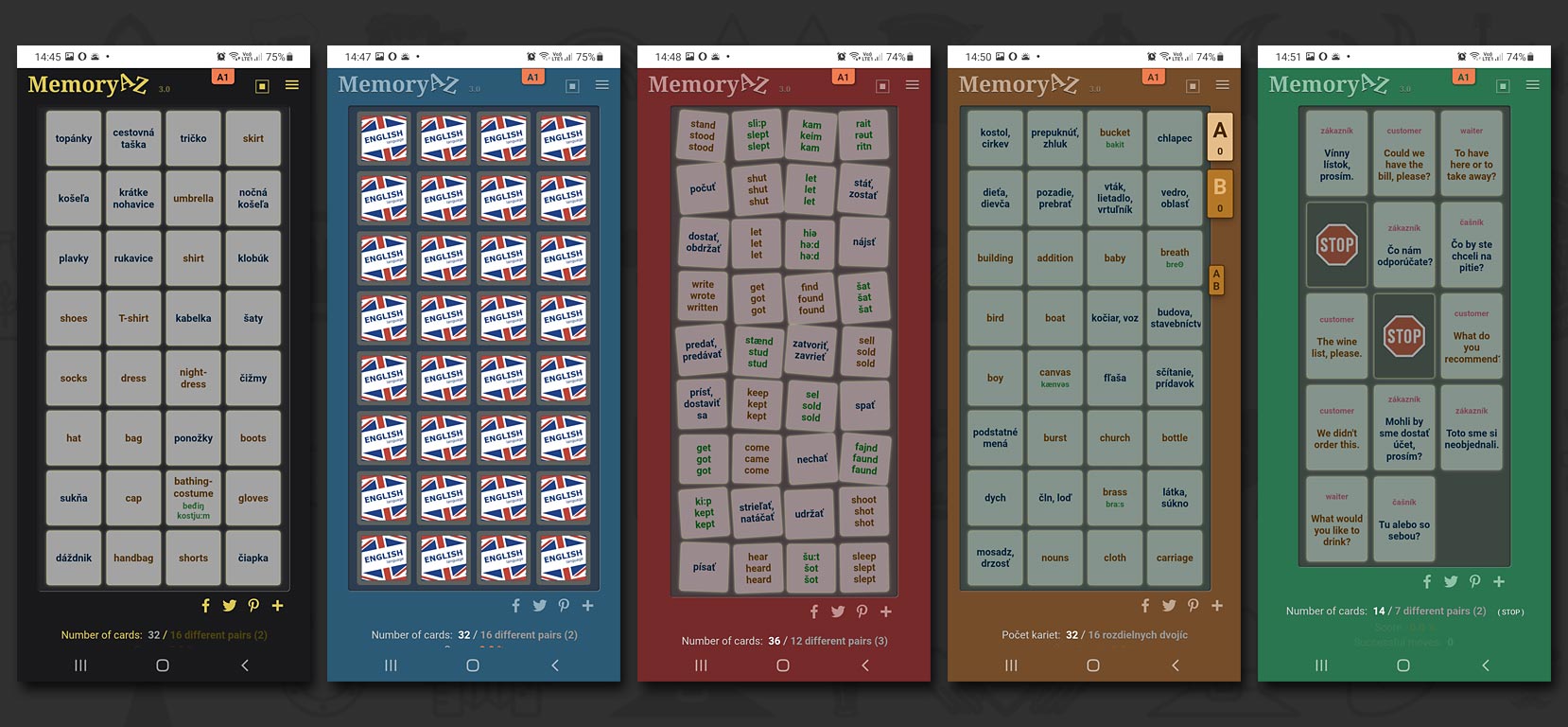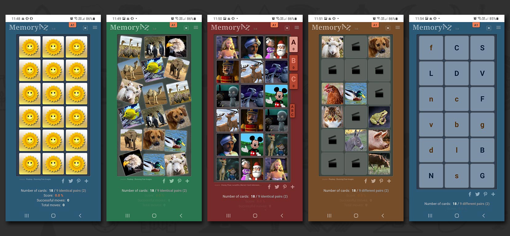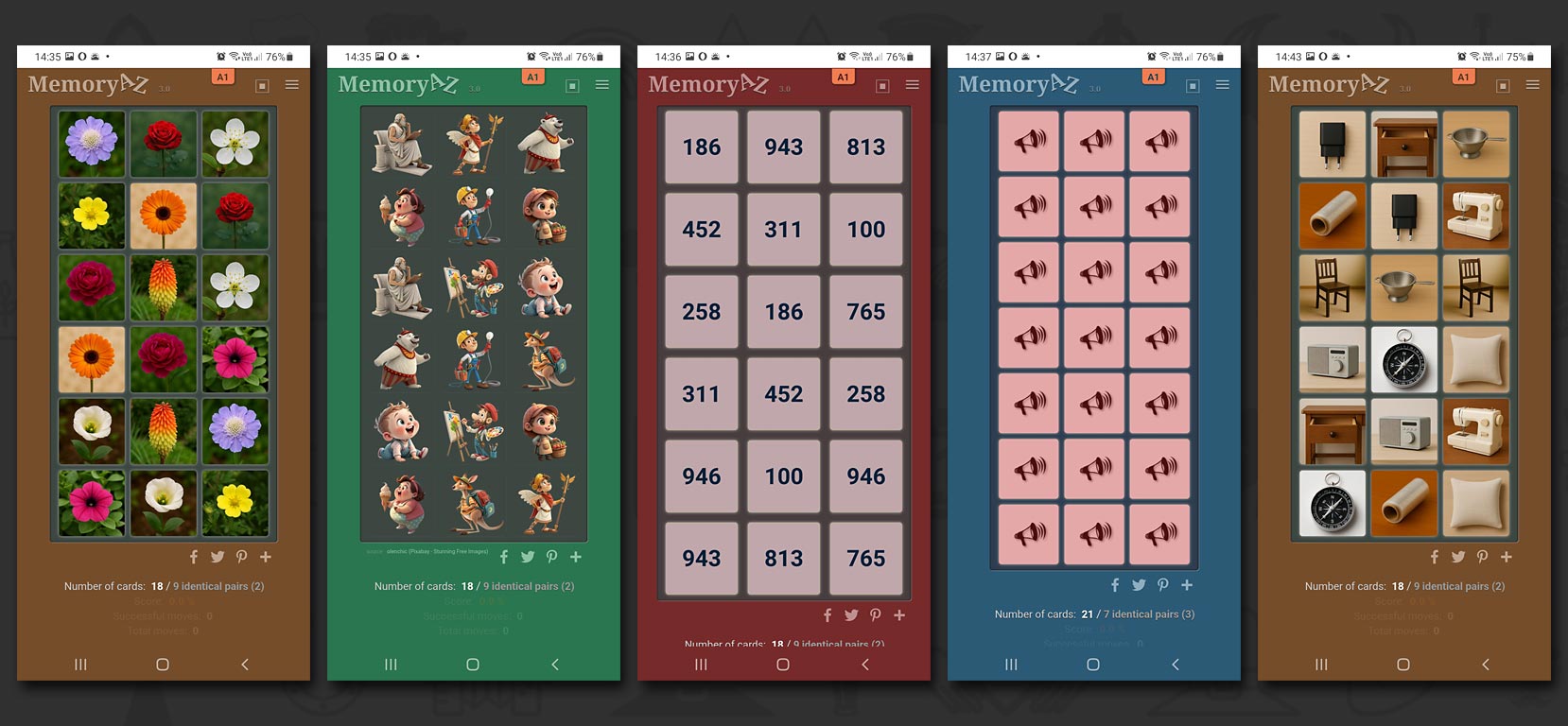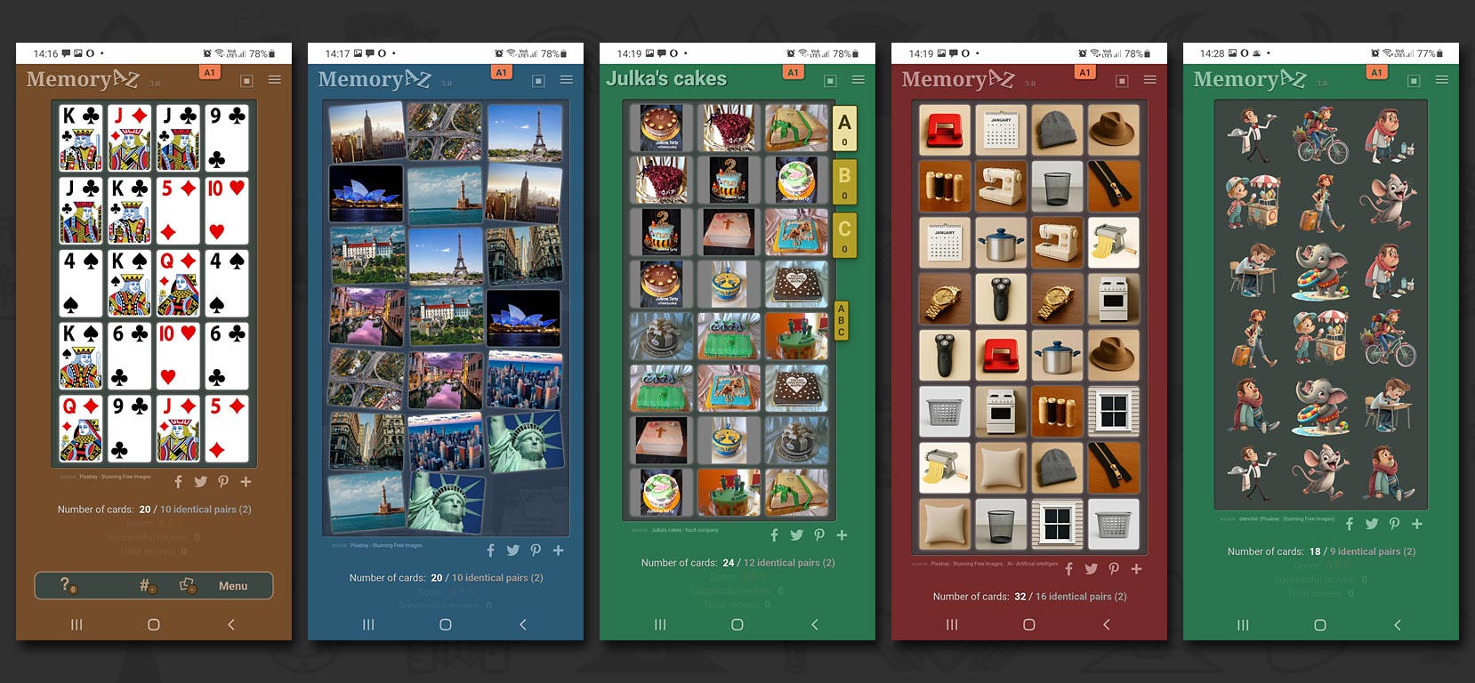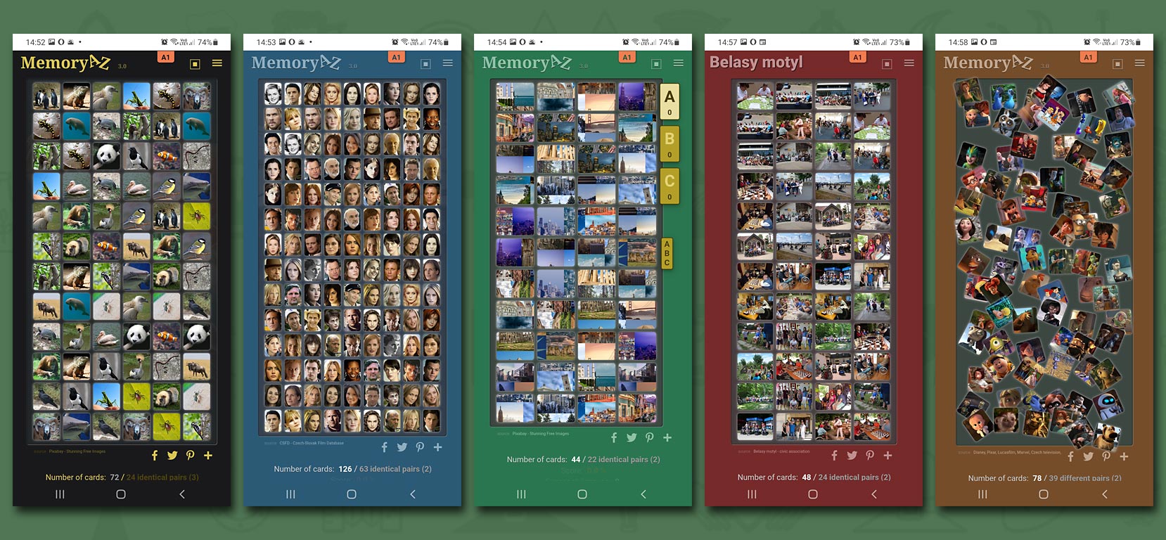 In addition to the classic game (with searching for same pairs of cards) there are different difficulty, where you need to find same (or different - but thematically similar) three of a kind, four of a kind, ...