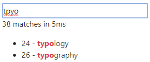 })fuzzysort.highlight(fuzzysort.single('tt', 'test'), '*', '*') // *t*es*t*const result = fuzzysort.single('query', 'some string that contains my query.')