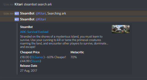Steambot Discord bot for searching for Steam games, connects to IsThereAnyDeal.com to also find you the cheapest price. Commands: steambot search <Game Name> steambot help