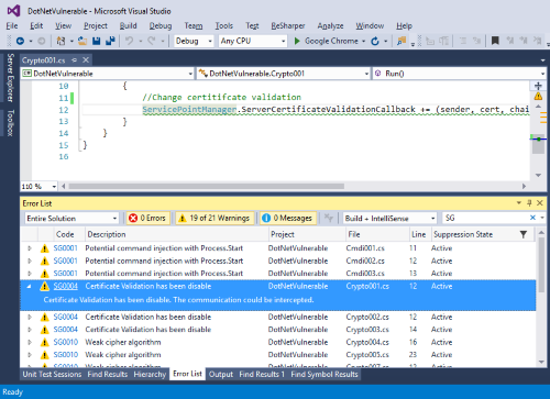 Roslyn analyzers that aim to help security audits on .NET applications. Website | Visual Studio Gallery | NuGet Screenshots The extension analyzes the code during the editing and when the project is built. For some vulnerabilities a code fix is suggested.