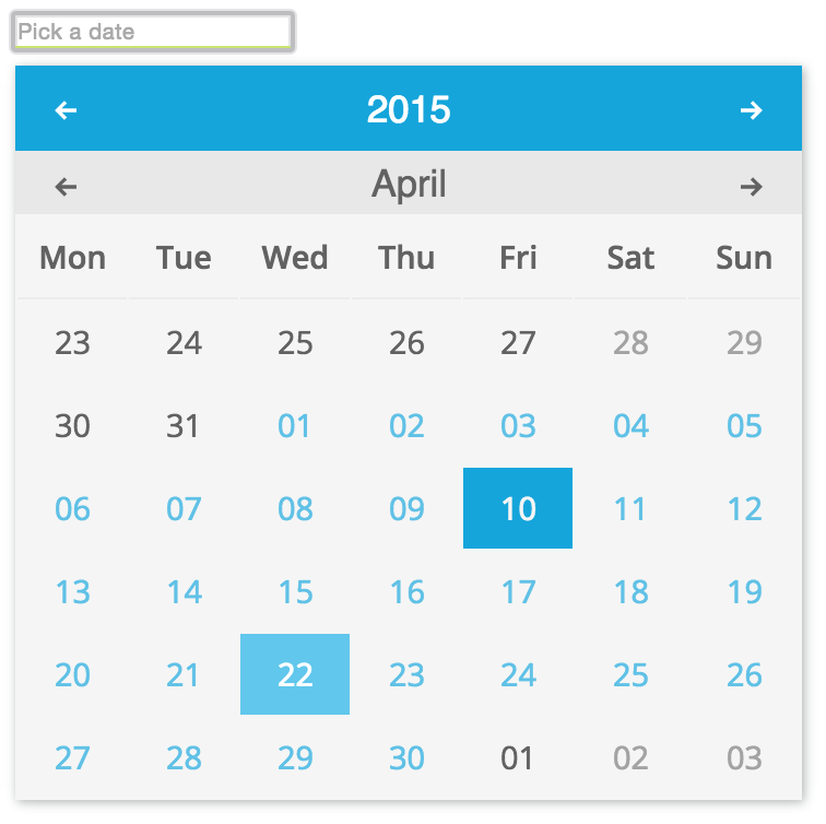 date-format="YYYY-MM-DD"></mb-datepicker>With the following attributes you can bind an element id, bind a class for extra styling to the input and all internal fields, etc. The calendar-header attribute has a two-way databinding to a scope variable, so you can add dynamic translations, that has the following setup: