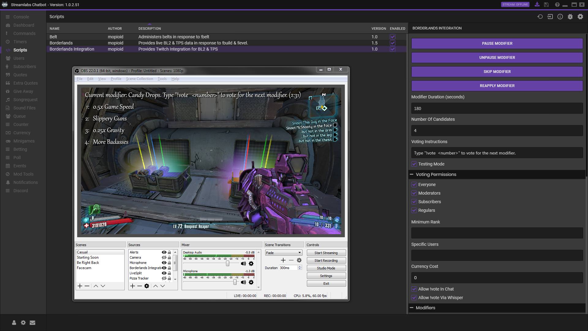 A Streamlabs Chatbot Script that applies modifiers to Borderlands 2 and TPS live as Twitch chat votes on them.