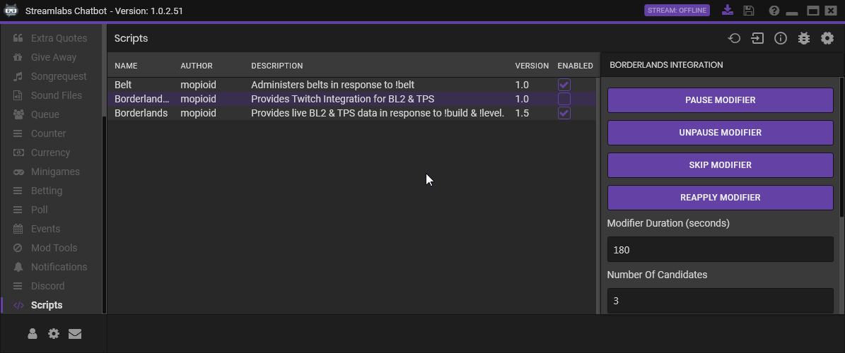 Borderlands Twitch Integration begins when the "Enabled" checkbox is checked next to it in the list of Chatbot Scripts. During this initial voting cycle, a random modifier is applied (chosen from the list of all enabled modifiers).