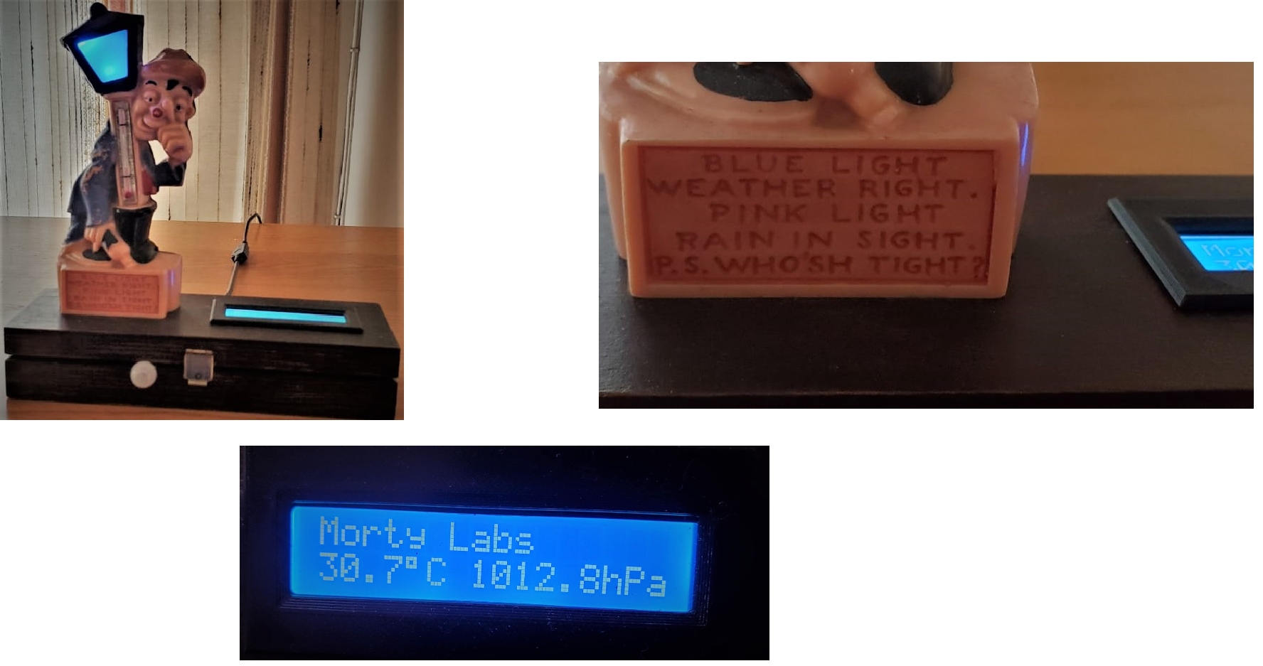The litmus paper is long gone, but now the figurine lives on with a modern twist. Hidden inside is an ESP8266 D1 Mini, paired with a barometric pressure and temperature sensor, a motion-activated screen, and RGB LED indicators that emit blue or pink light. It once again informs you of changing weather conditions, but also publishes data via MQTT (or logging it directly to InfluxDB) for full smart home integration with Home Assistant.