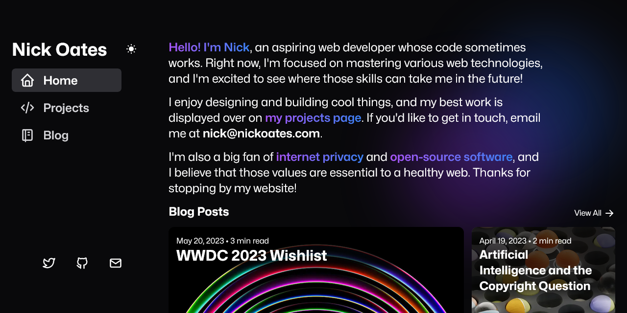 This is my website, blog, and portfolio. I designed and built it myself using Next.js, Tailwind CSS, TypeScript, and MDX. For more information on the tech stack, see my initial blog post. Parts of the design were inspired by Lee Robinson's website and Apple's newsroom.