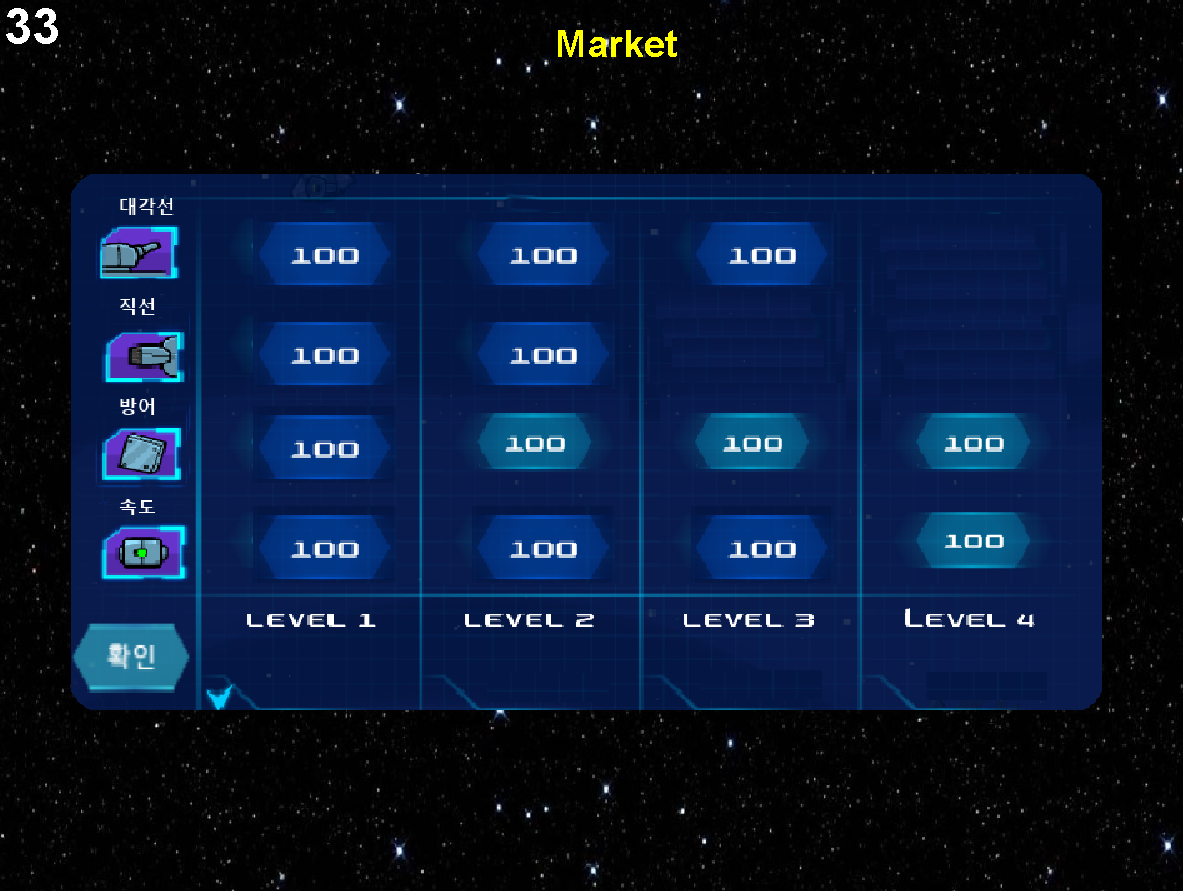 Market에서는 우주선의 업그레이드를 할 수 있음. 총알의 대각선, 직선, 방어, 속도 총 4가지 종류가 존재하며, 레벨에 따라 강화의 확률도 다르게 함.