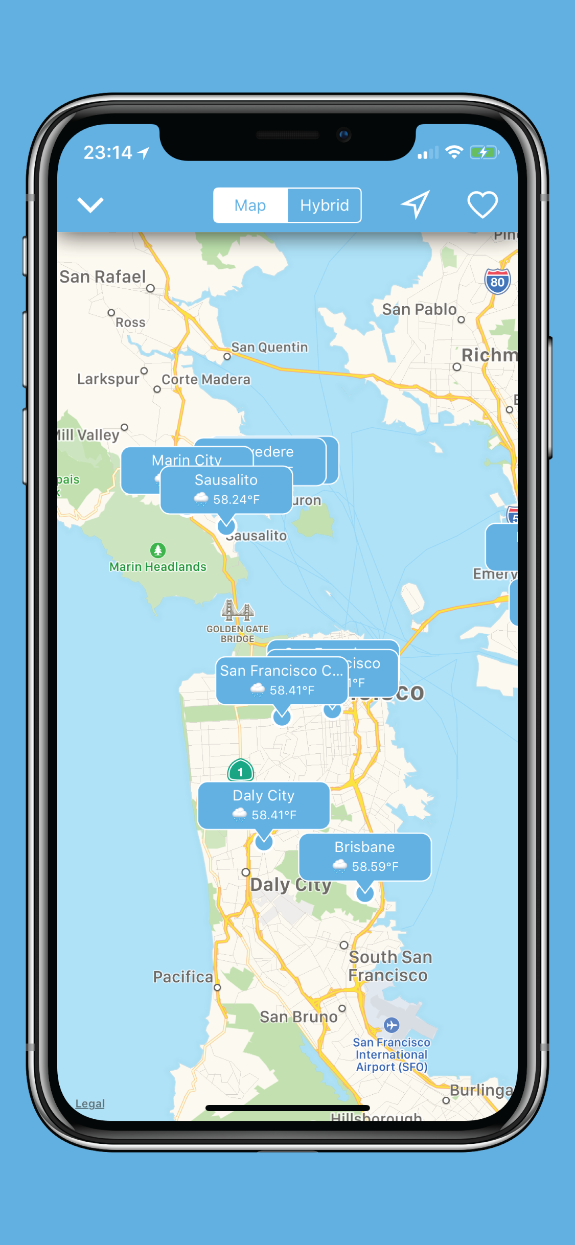 - See current weather information for bookmarked and nearby places via a list and a map view