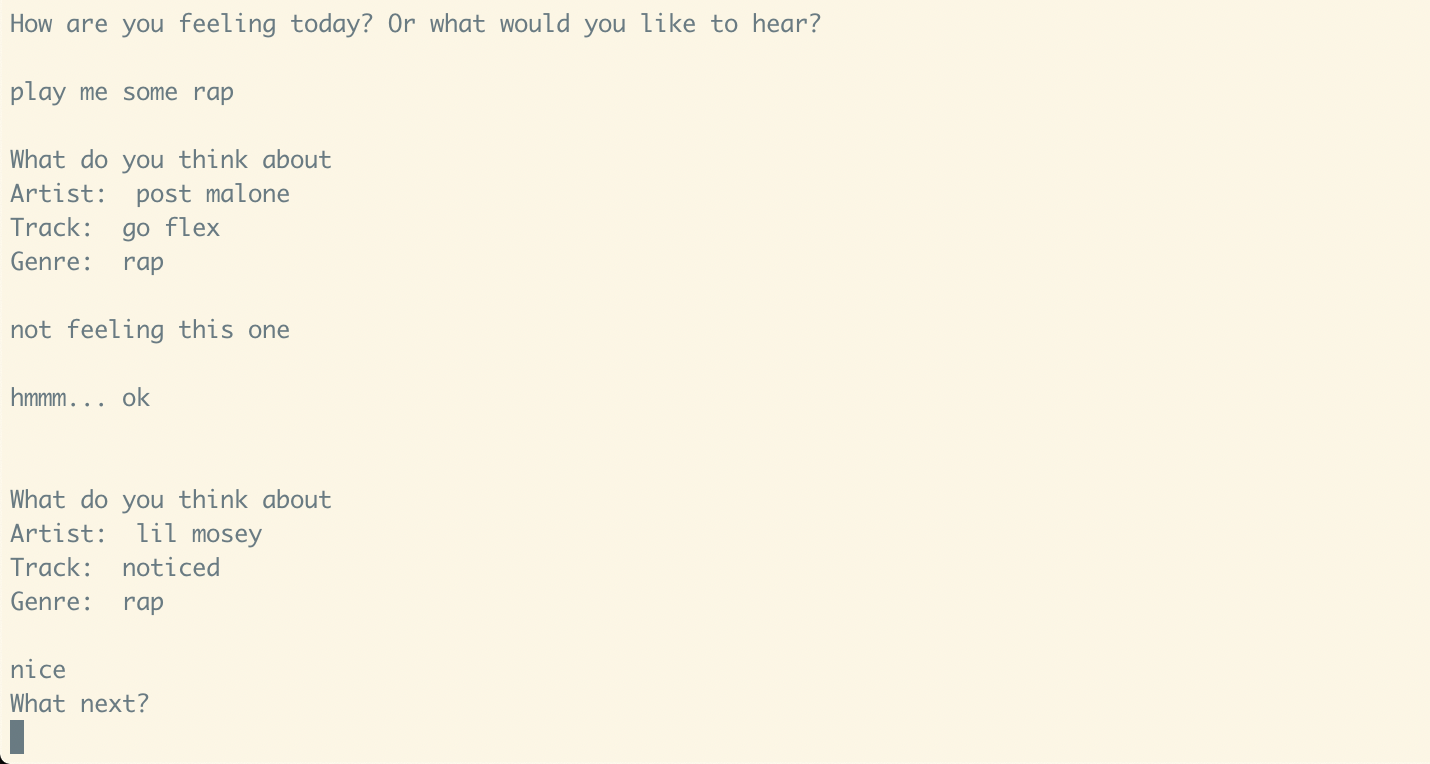 Mood-DJ Song suggestion bot based on user mood. Dependencies: Pandas Flair Usage Create Model $ python create_model.py Run $ python chat.py best-model.pt Examples Authors Leonardo Ostjen Couto Pietro Degrazia