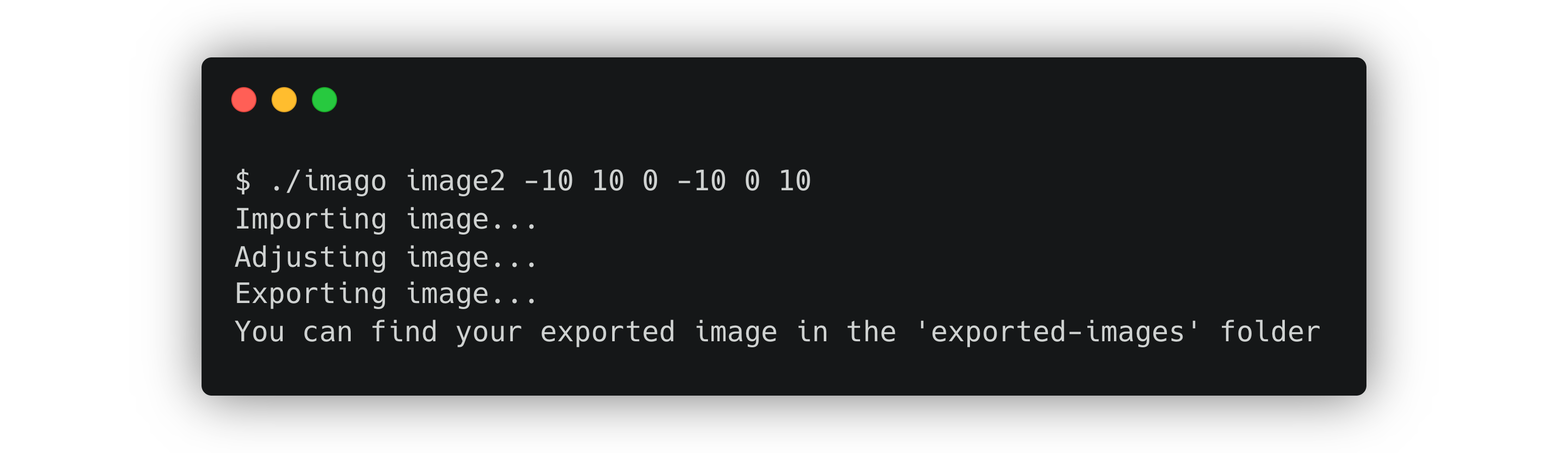 ./imago image2 -15 10 0 -10 0 10Note: Do not include the file type in the first argument. i.e. if the file is called 'image2.png', don't including the '.png' part in the argument.