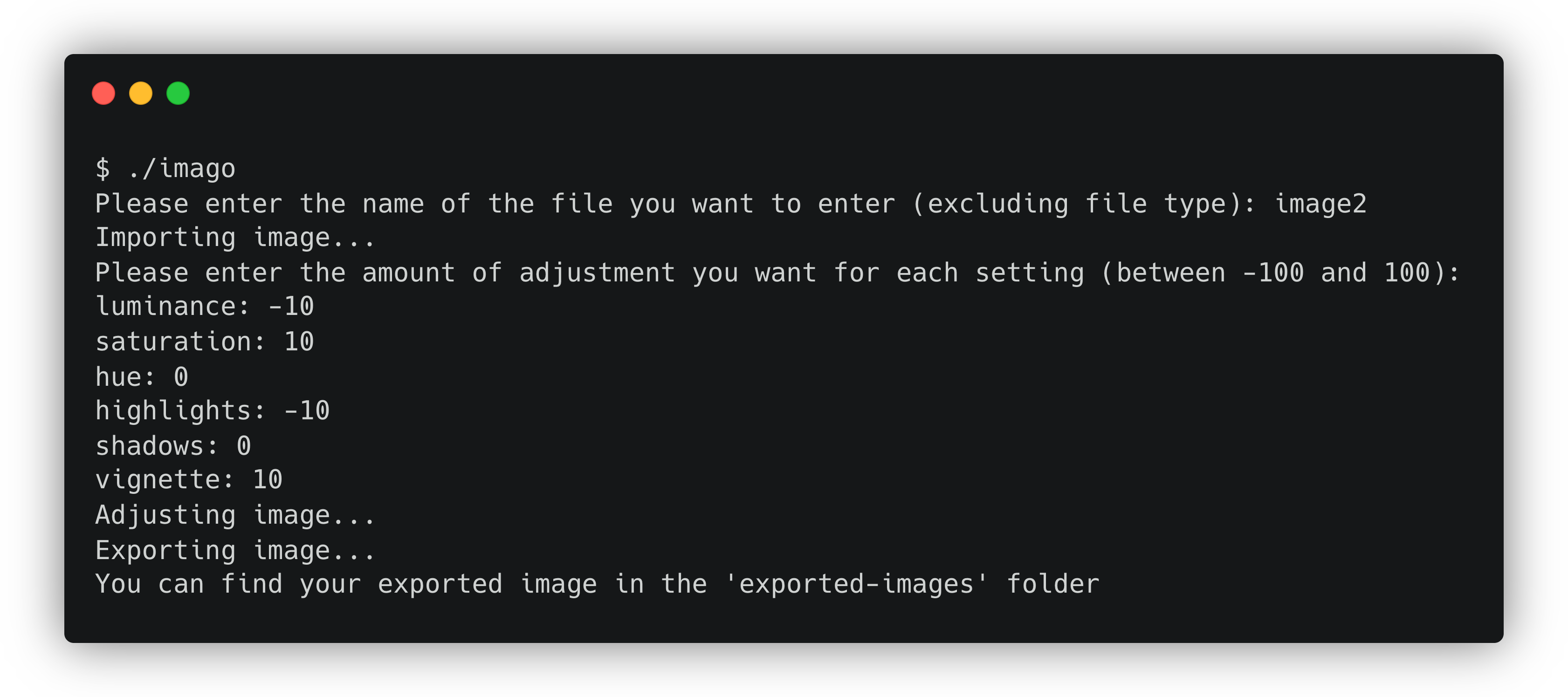 ./imago imageFileName luminance saturation hue highlights shadows vignetteYou need to pass an integer in range [-100, 100] (inclusive). For example: