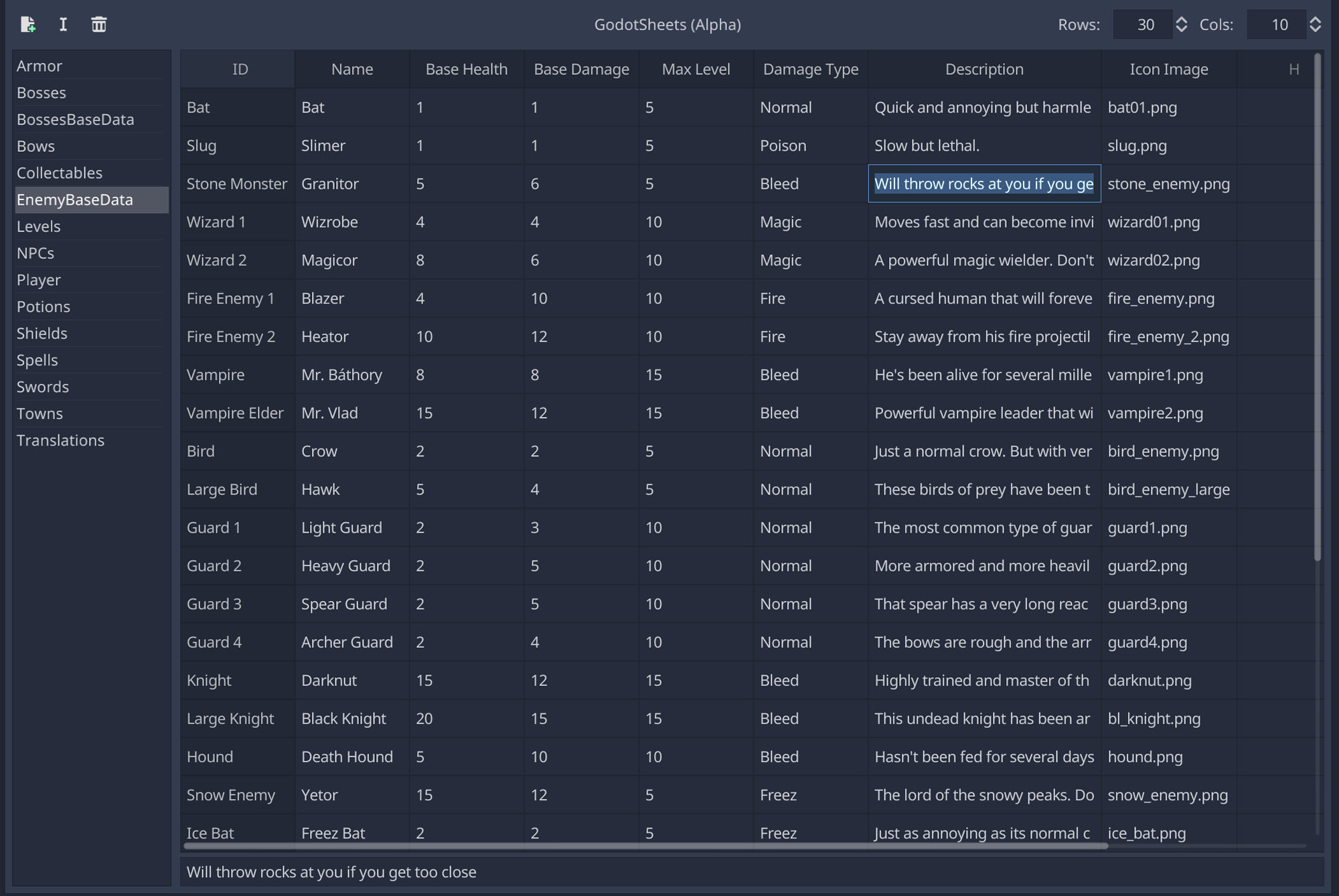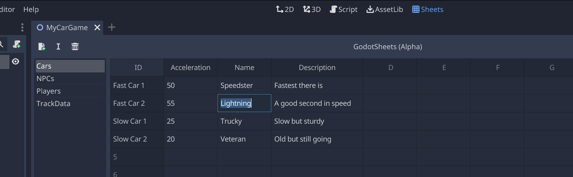 From there you can add data sheets (for example, "Weapons", "EnemyData", "Items", etc.) and start adding data to them.