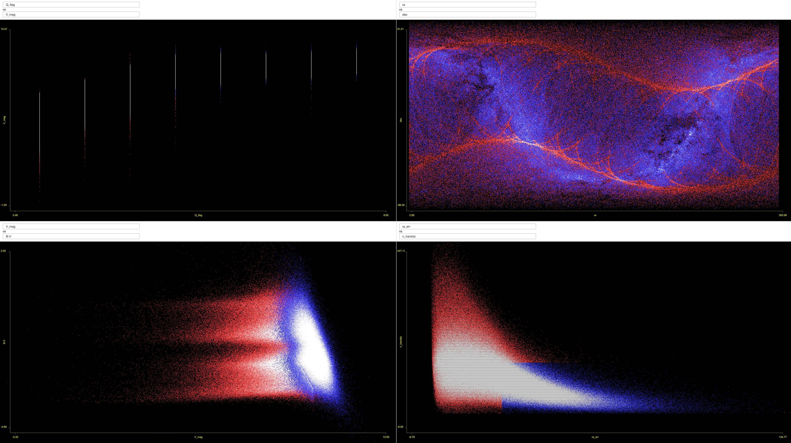 Alternatively, if we highlight just the stars with a high error in their right ascension measurement (right side of the bottom right graph), we tease out the precessing circles that characterize the observation pattern of the telescopes that created the catalog.