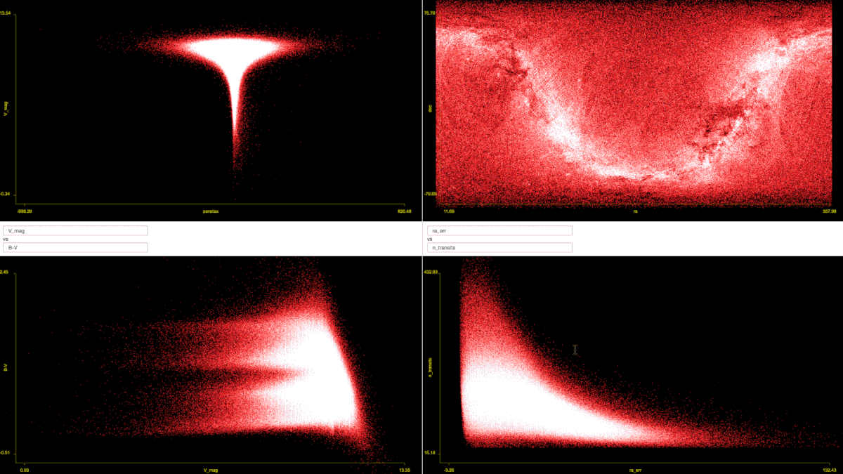 Viewpoints is designed to handle extremely large data sets such as the entire Tycho Catalog--over 1 million stars. When all stars are graphed using declination vs right ascesion, you can see the structure of the Milky Way.