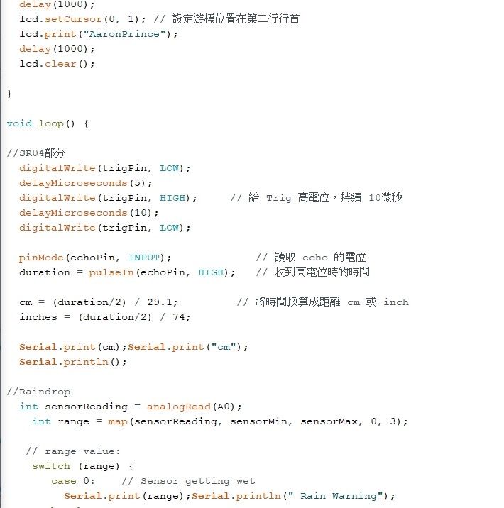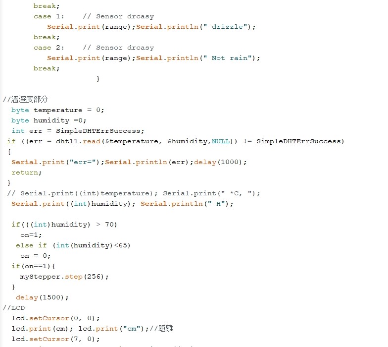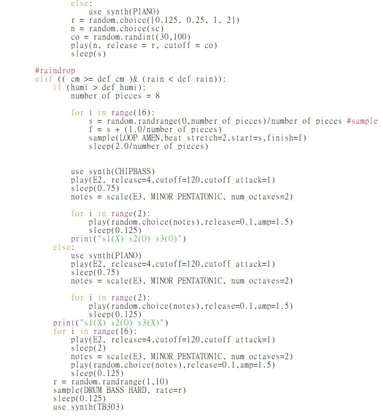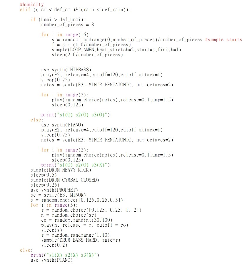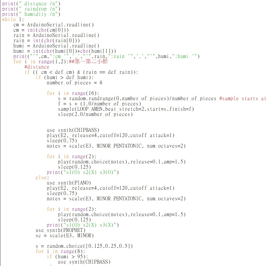 1.cm 2.rain 3.humi分別為控制音樂的元素 假設只有rain達到播放條件 則只有鋼琴聲 假設只有cm達到播放條件 則只會有隨機電音 humi則是會增加一小段音樂