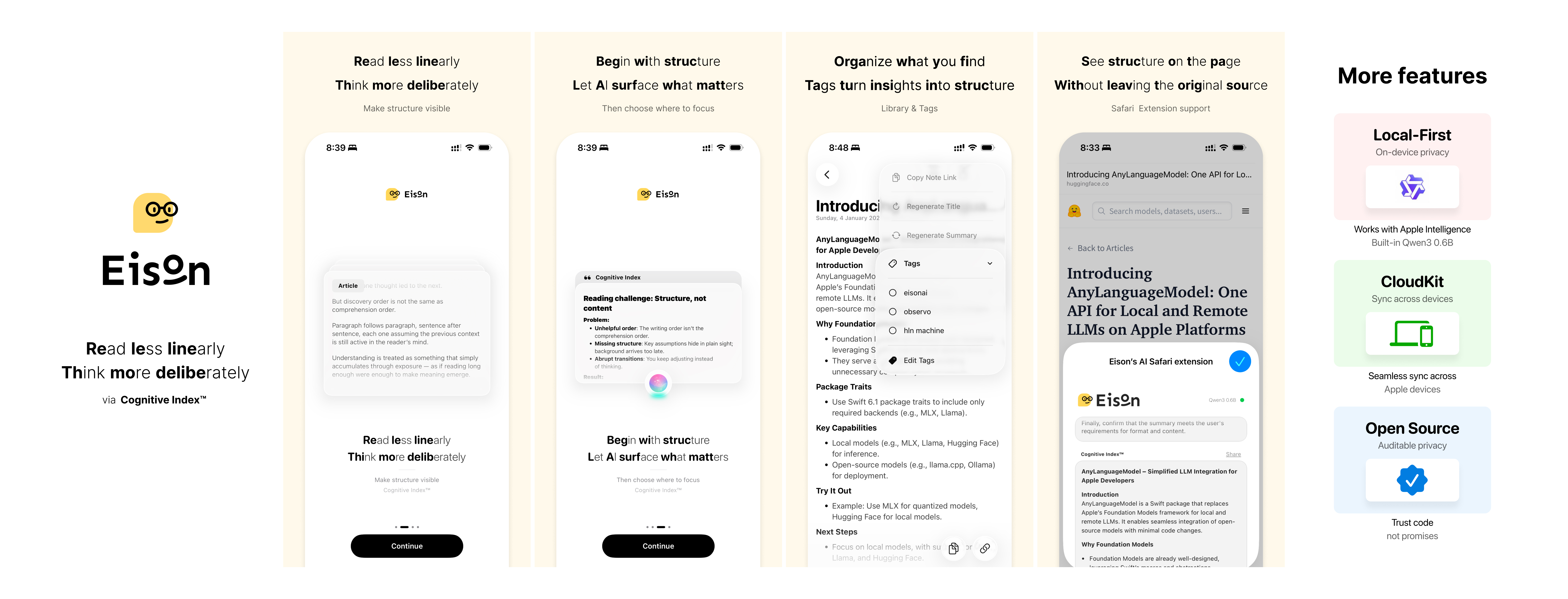 EisonAI is an macOS / iOS / iPadOS Safari Web Extension + App that turns “structure” into a visible entry point for reading. You don’t have to follow the author’s linear narrative—see the key points and structure first, then decide where to dive in.
