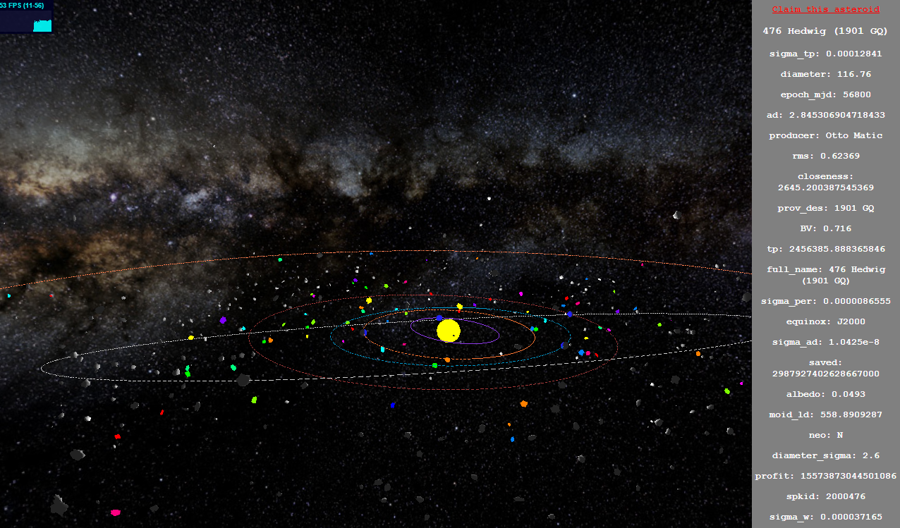 asteroid-claiming game view based on REAL asteroid data from a scientific database of over 600,000 asteroids.: