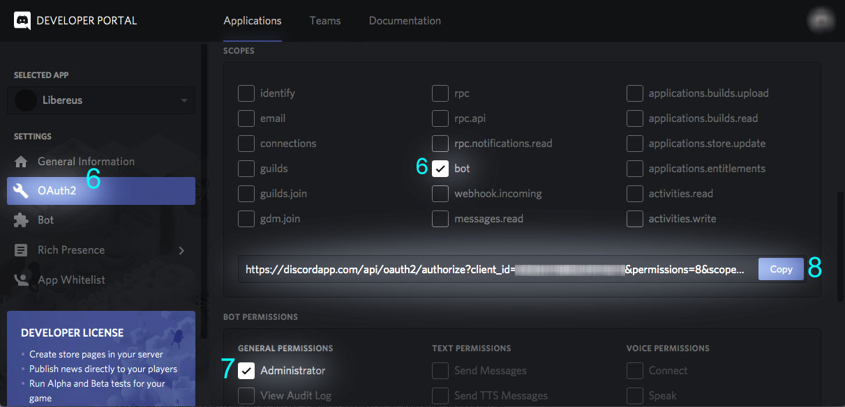 - Now click on "OAuth2" on the left navigation panel, scroll down to "Scopes" and then tick on "bot".