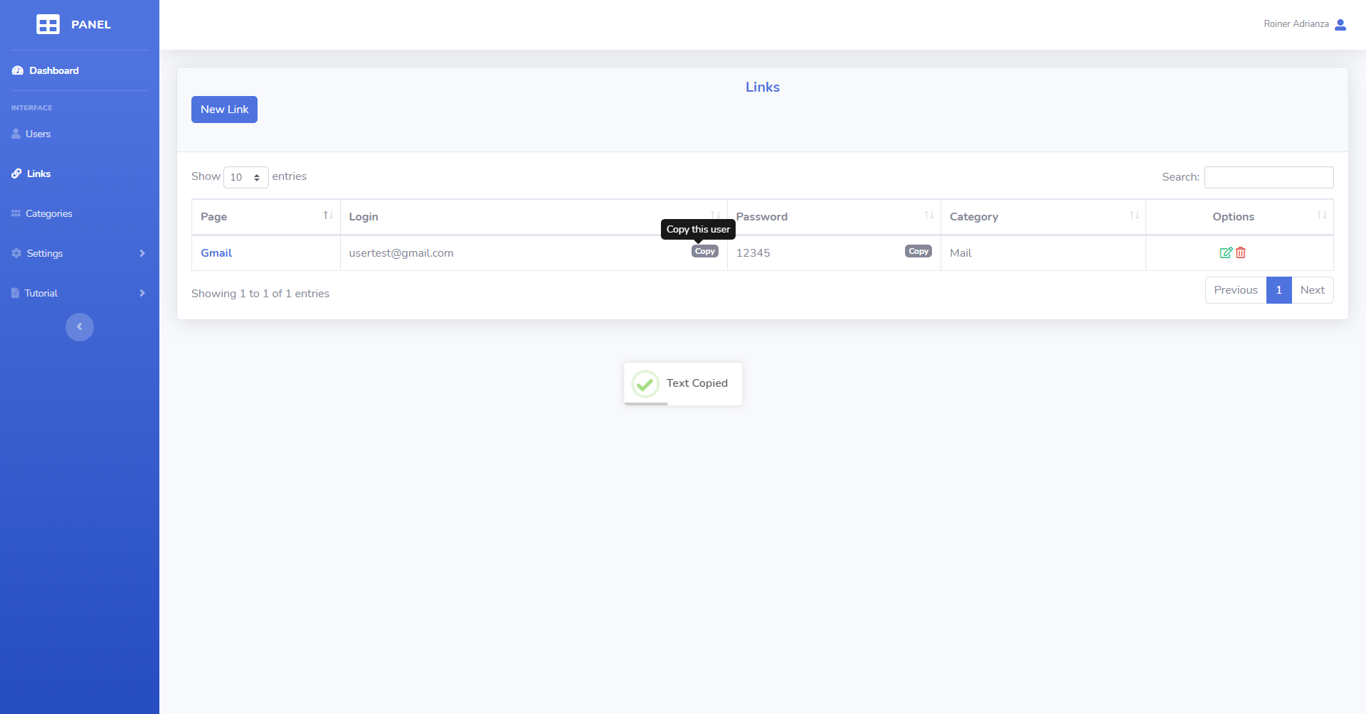 - Abrir link del sitio web, botón para copiar usuario y contraseña.