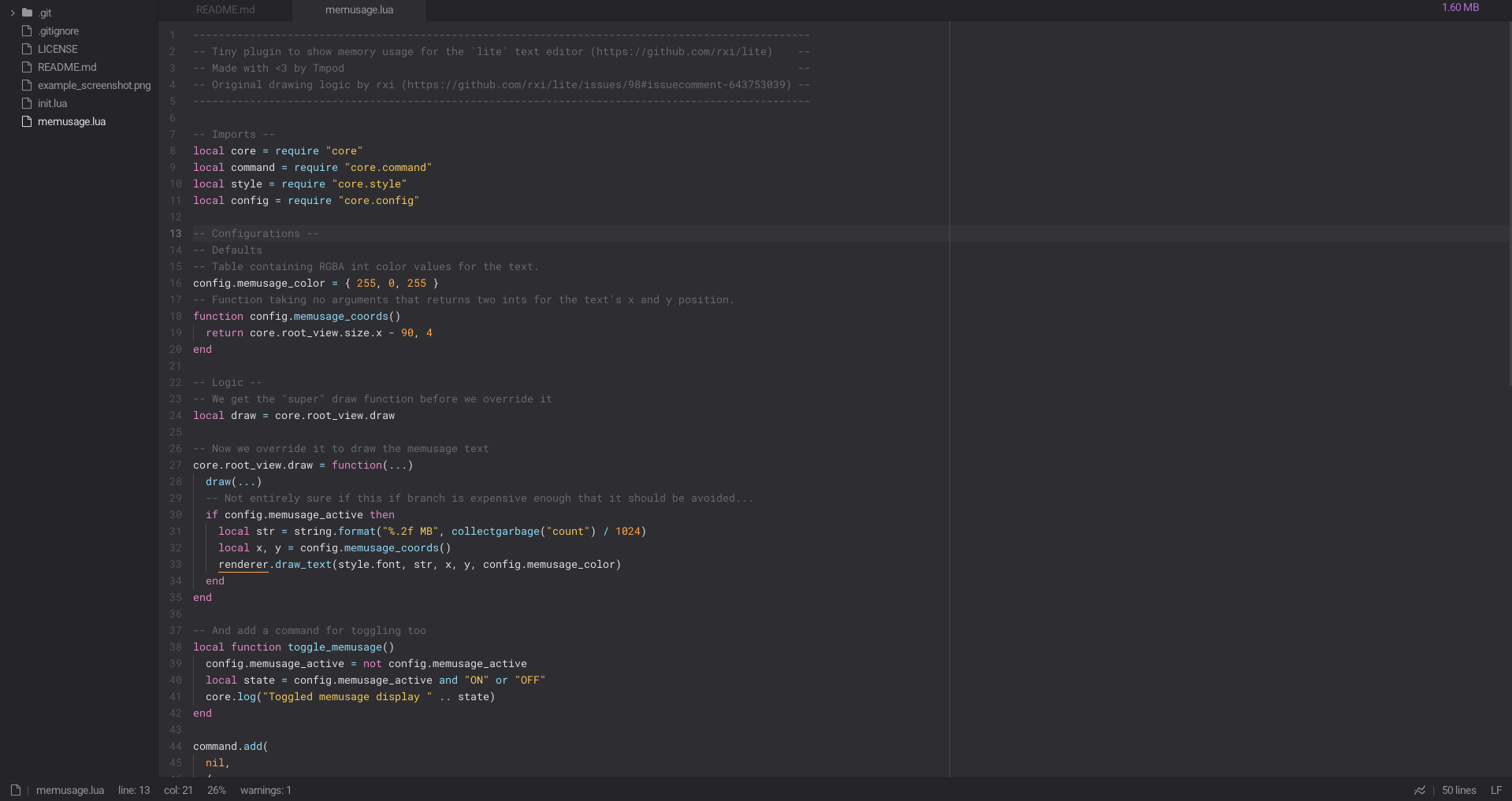 Back with another little utility plugin. This time I simply spruced up a memory usage display function rxi had given me a while back (rxi/lite#98 (comment)), giving it a toggle command and a couple of configurations.