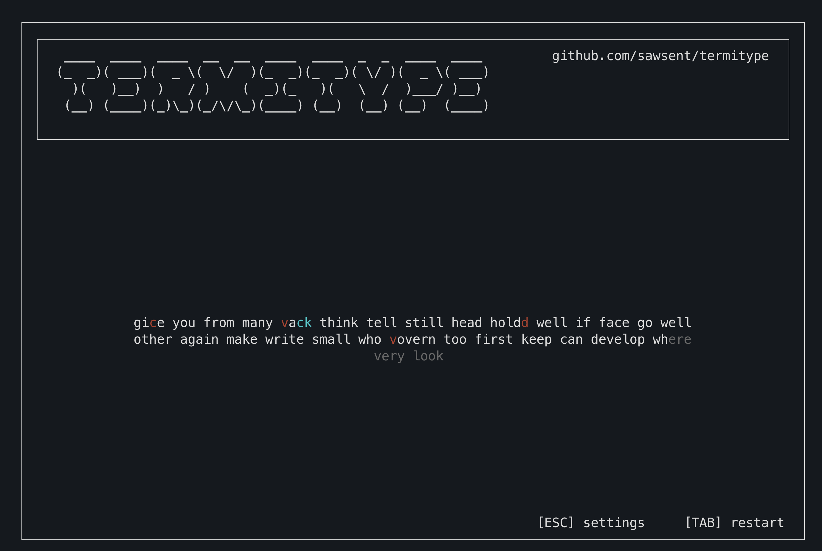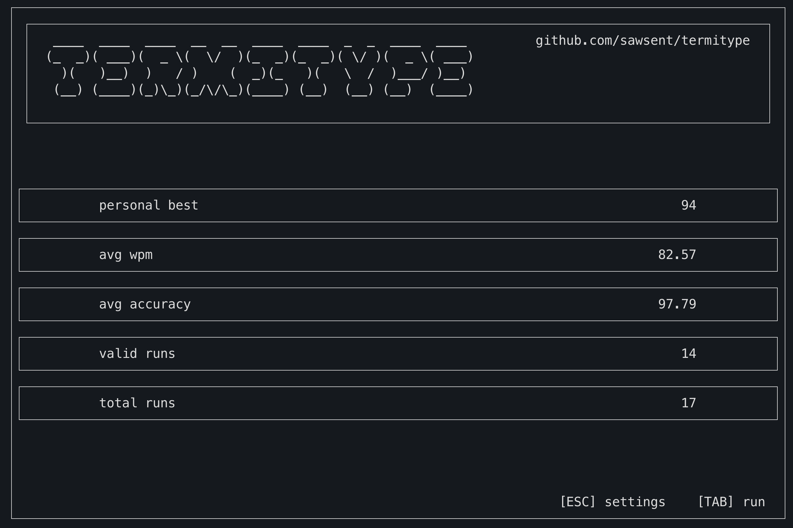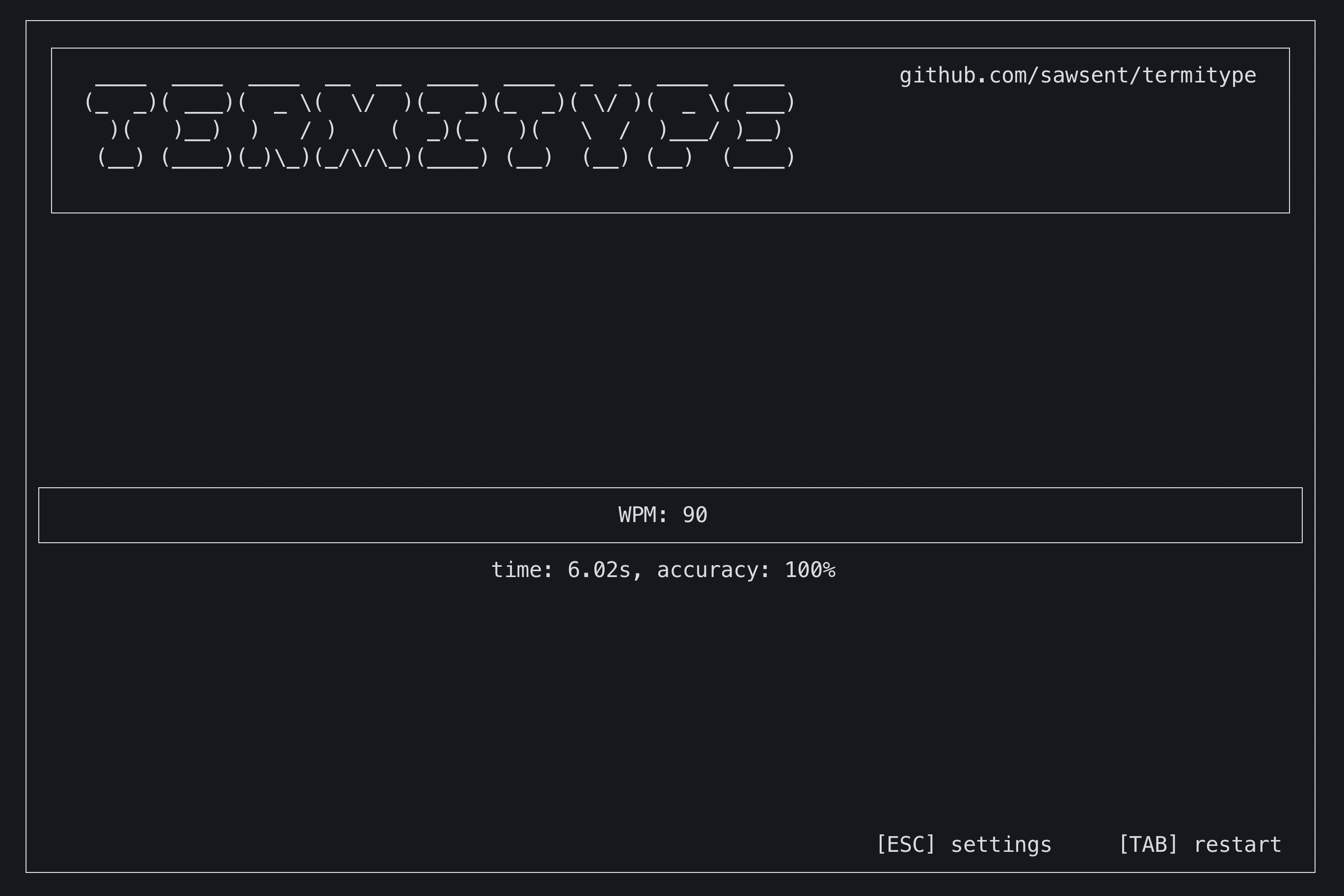 pip install termitypeJust run the termitype command to open the app!