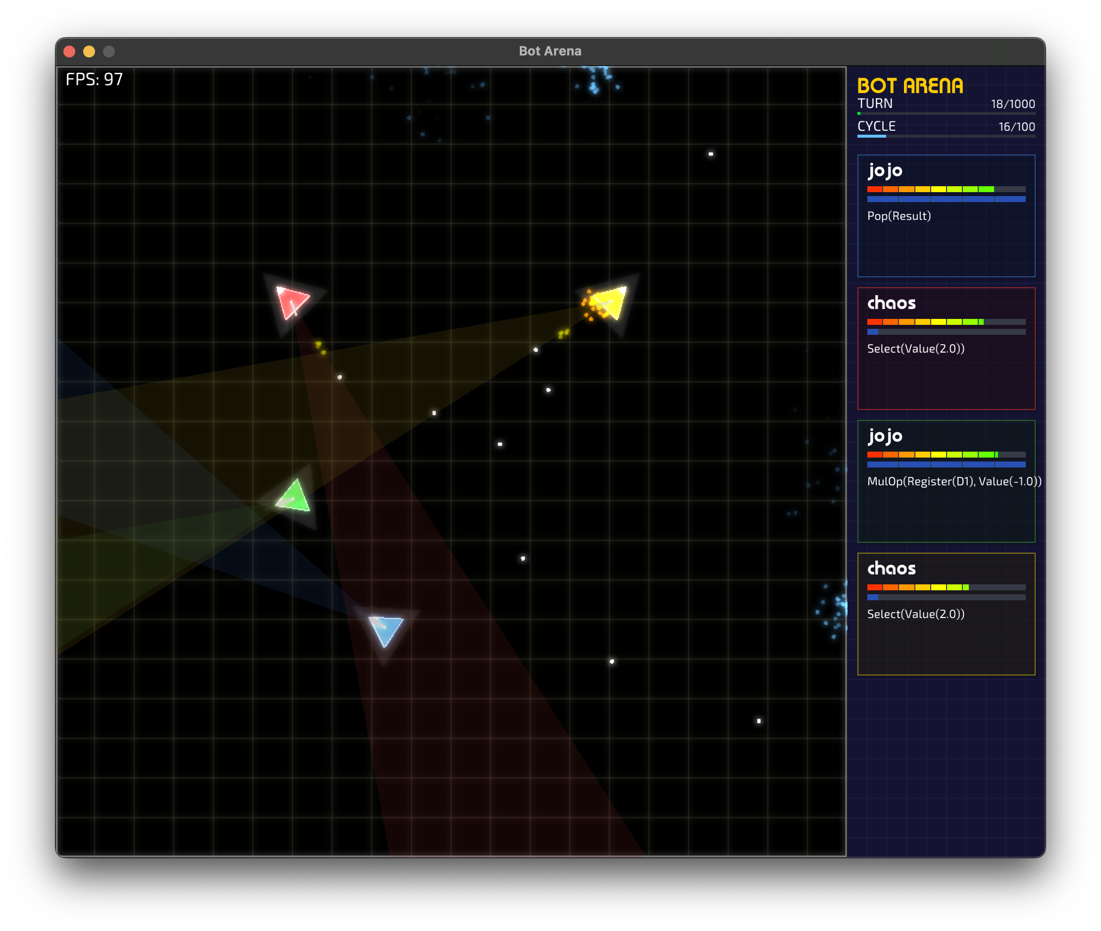 cargo run -- bots/chaos.rasm bots/jojo.rasmUsage: botarena [OPTIONS] <ROBOT_FILES>...