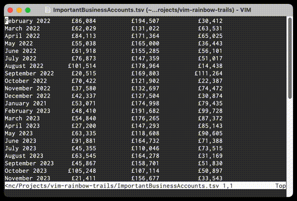 highlight RainbowViolet guibg=#080808 ctermbg=232Of course! Rainbow Trails works NATIVELY in terminals where 'termguicolors' is enabled, and I have METICULOUSLY selected an appropriate set of colours for use in 256-colour terminals. If you have fewer than 256 colours available, you may wish to configure the highlighting further. (See above.)