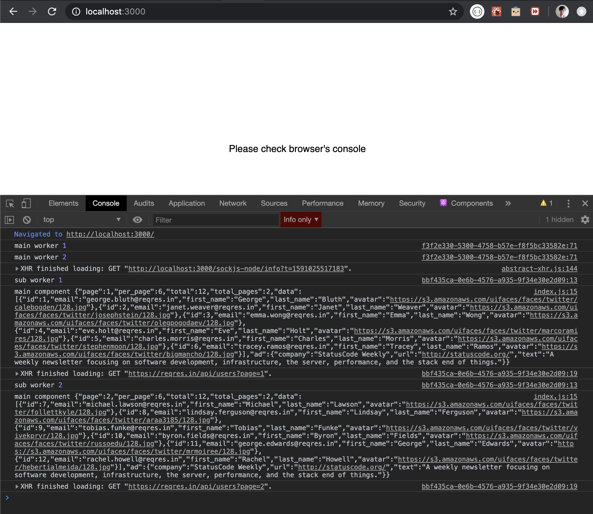 This is built based on the example given in https://github.com/bharathnayak03/react-webworker-hook but with additional parts where I go through several rounds of trials of errors to explore web workers.