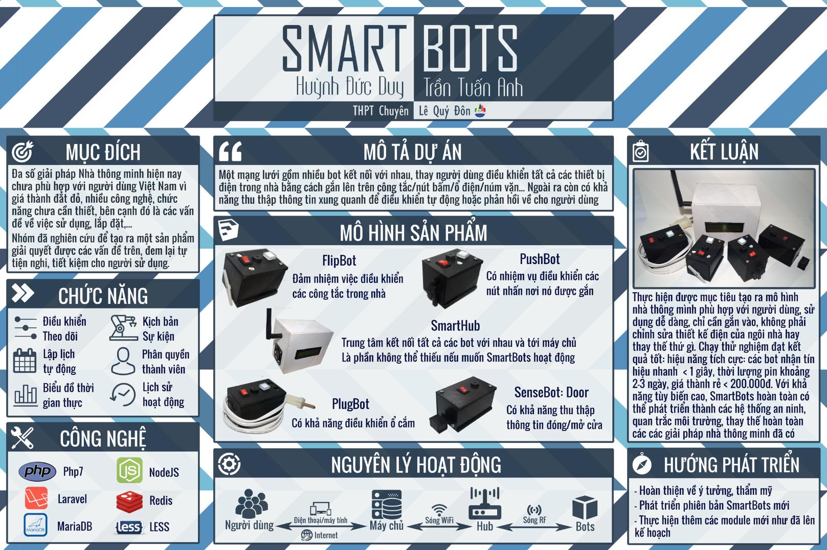 IoT project - cheap solution for smarthome, a network consists of multiple bots, helps people in control of electronics by attaching these bots onto the switch, button, plug,... instead of replaces them. This project can help people set up a smart home easily at low-cost. Contest in many major competitions in Vietnam and won high prizes.