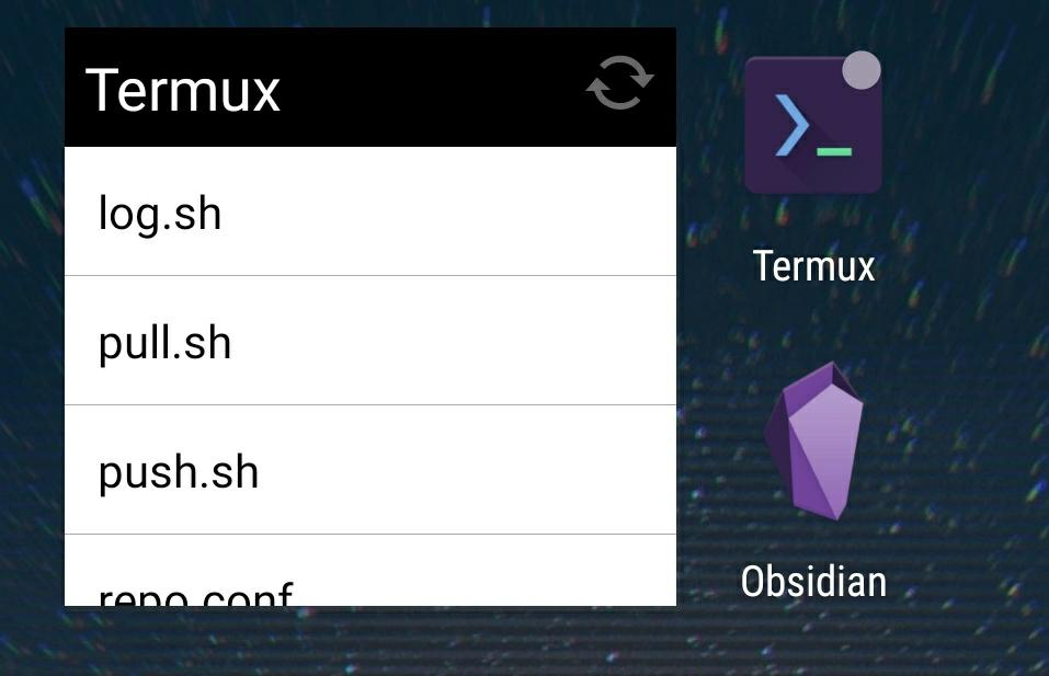 Clone the repository, then copy the pull.sh, push.sh, log.sh , repo.conf into your termux .shortcuts directory to be able to trigger them from homescreen widget.