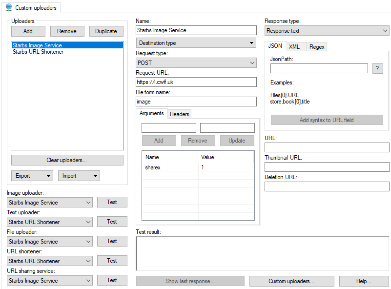Modify the configuration files in 'config', then follow the setup in ShareX Destination Settings as shown below: