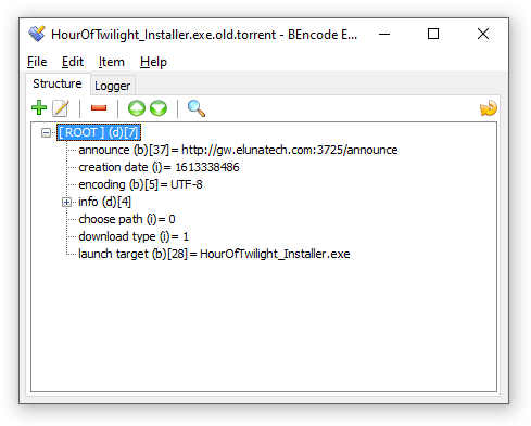 The torrent file can be created using any bittorrent program. Take note of the split size used, for me I set the split size to 16384 kb. Once you have created your torrent file you can use BEncode Editor.exe to edit the data in the torrent file. We can add various properties to the file that the Blizzard Downloader reads to know how to behave.