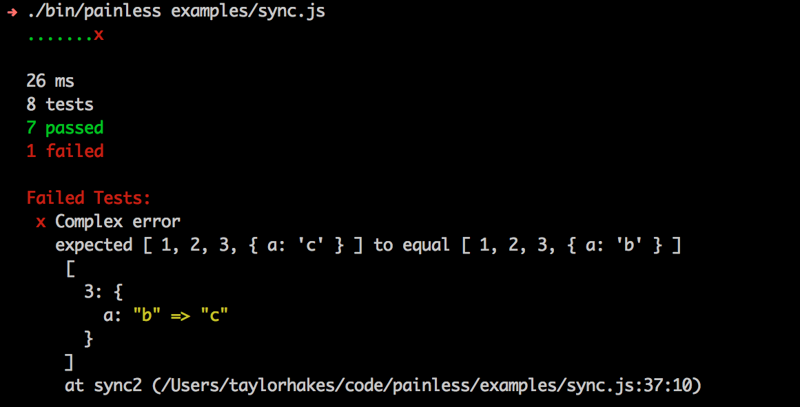 t.end(). Your tests end based on the return) - Better output format out of the box (Easier to read than TAP. painless supports TAP too)