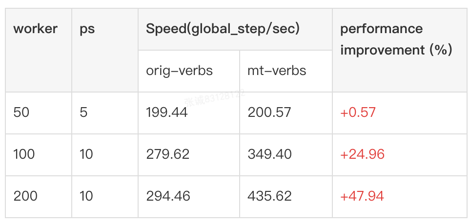 As above results shown, mt-verbs achieved similar performance as orig_verbs in small distributed scale (50 worker and 5 ps), and achieved 24.96% and 47.94% performance improvement respectively when using 100 worker and 200 worker.