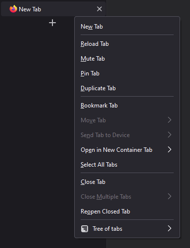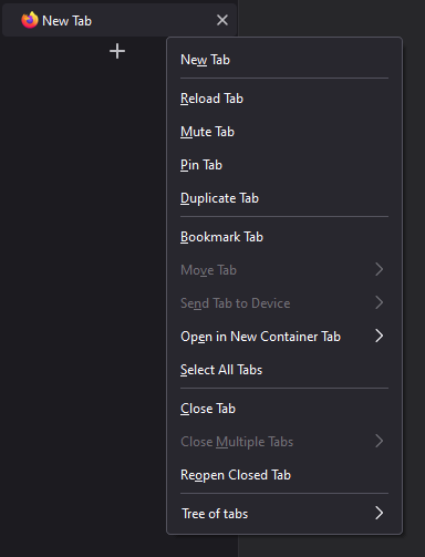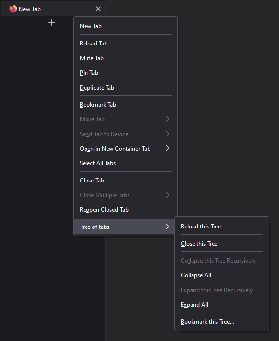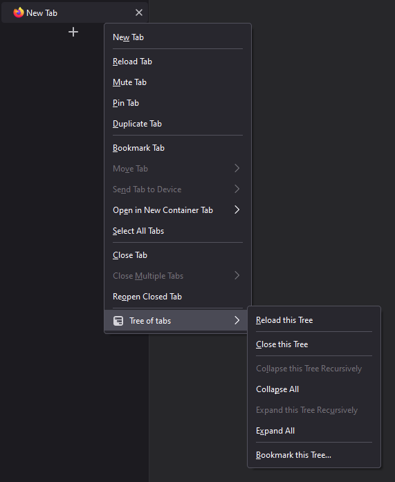 Over the course of the Proton UI refresh, all icons were removed from the context menus in Firefox. Since that change has happened, Tree Style Tab doesn't conform with the new design.