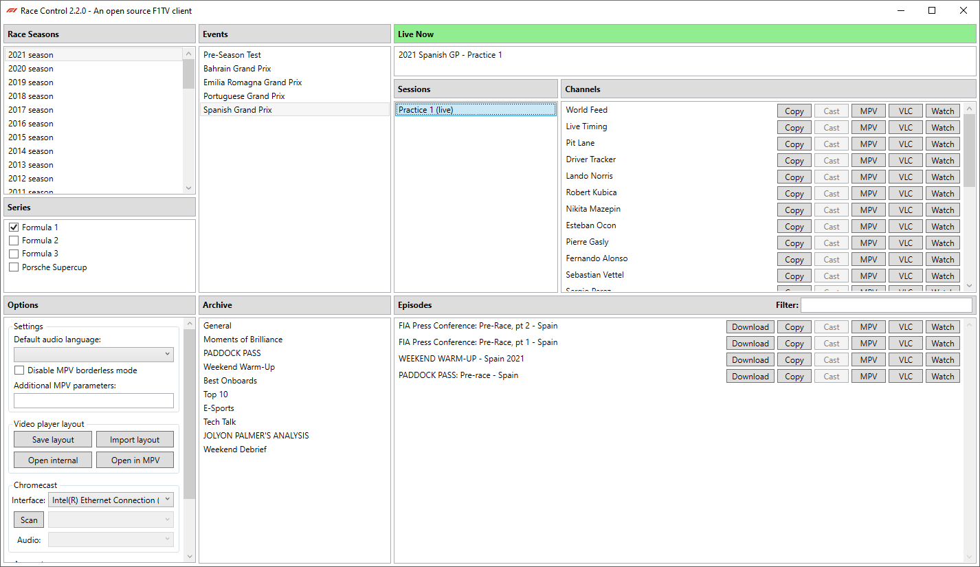 Race Control is an open source F1TV desktop client for Windows. It can be used to watch content (both live broadcasts and replays) in the highest quality available, using either the built-in player or an external media player of your choice. The goal of this project is to improve the overall experience by implementing features not found in the official website and apps, while still being easy to set up and use.
