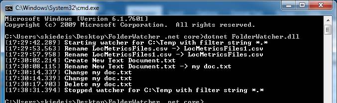 FolderWawtcher is command-line .NET Core application that monitors a file directory and outputs all events happening in that directory.