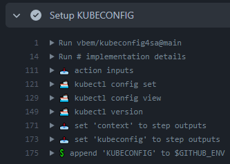 to=$(kubectl get secret $as -n MYNS -o jsonpath='{.data.token}'|base64 -d) && echo "K8S_SA_TOKEN: $to"Remember to store both K8S_CA_BASE64 & K8S_SA_TOKEN in your Git repository Encrypted secrets or Environment secrets.