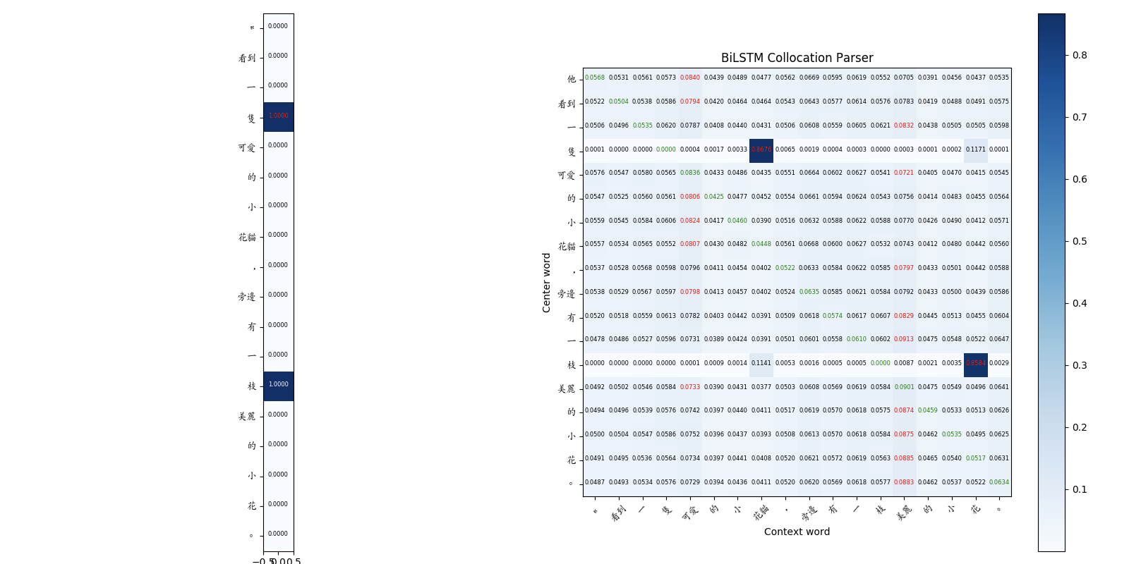 用 BiLSTM+ELMo 搭建的 Collocation Parser,可以抓取句子中特定的Collocation Pairs,如名詞<->量詞、動詞<->名詞等等,用以建構Ontology及其他應用。雖直接使用Dependency Parser也能有差不多效果,唯Dependency Parser一次要預測許多不同詞類的arcs,易受其他詞的arcs連結干擾影響正確率,且中文的Dependency Parser表現較差錯誤率稍高。此Project專注抓取Collocation Pairs,先使用unsupervised word2vec-based簡易方法有效的得到許多有關連的詞類pairs,透過少量標註(1000句)找出正確率夠大的頻率區間,拿來train後續的BiLSTM Collocation Parser。