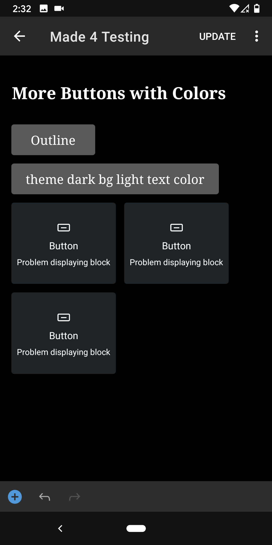 Result: button blocks with custom colors or gradient backgrounds are not rendered in the block editor in the app and instead show a "Problem displaying block" error.