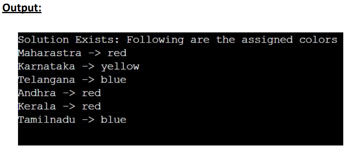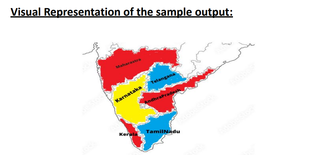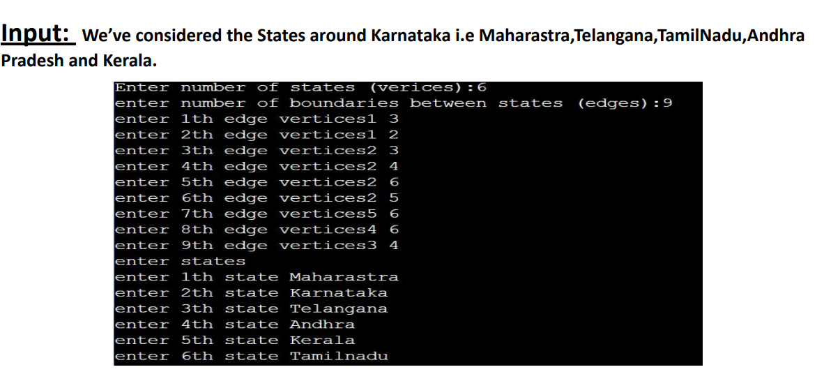 Input: graph G (V, E). Output: Colored Graph with the number of colors. Step 1: Assign an order to the set of colors. Step 2: Considering the first vertex in the vertex order, assign to it the first color. Step 3: Considering the next vertex, assign to it the lowest-ordered color that has not already been assigned to a vertex adjacent to it. Step 4: Repeat step 3 until the graph is colored.