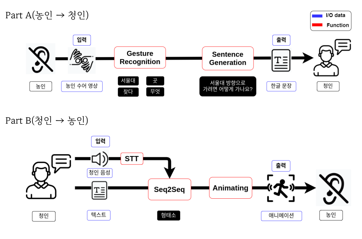 청(聽)개구리 2021 디지털 신기술 실무인재양성 해커톤 대회에 참가한 팀입니다. 수어와 한국어의 양방향 번역 시스템을 만드는 프로젝트를 진행했습니다. 구상도 개발 환경 Python 3.7 Flask 2.0.1 Blender 2.91.2 Pytorch 1.7 Tensorflow 2.3 OpenCV 4.5.1.48 HTML5 JS 팀원 김강태(KangTae123) 김인유(willowkim8) 양창원(Shinest-changwon) 이경원(yeoooo) 조웅제(Woonn)