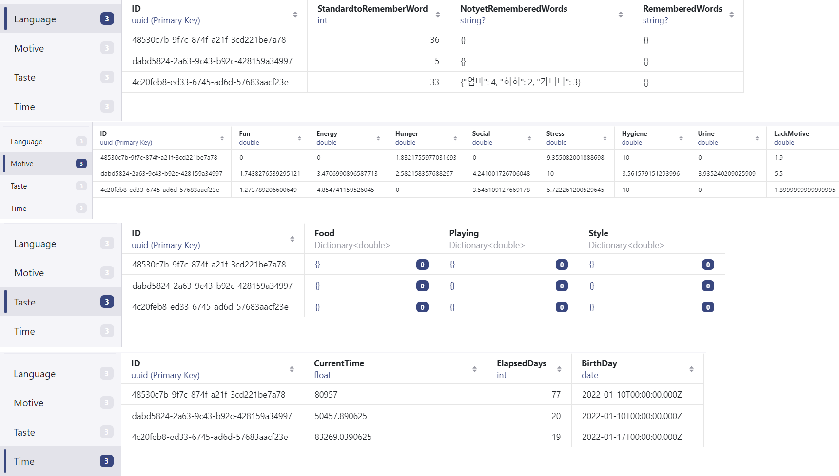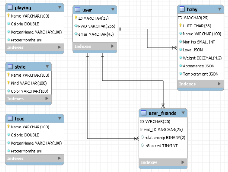 IWanit 아기 취향/성격 기반 모바일 육아게임 (21.07 ~) 개발 환경 기술스택 Client Unity Server Nodejs, (예정)AWS EC2 DB MySQL, Realm 데이터베이스 스키마 MySQL Realm 로컬 DB 개발 진행상황 메인화면 육아 기능 연결 UI 아기 개월수 시간 UI 환경설정 육아 목욕 말하기 용변 밥 잠 외출 놀이 아기 터치 반응 필요 애니메이션 랜덤 말하기 기타 디자인 회원가입 로그인 계정 관련 설정-서버 계정 관련 설정-클라이언트 환경설정 DB연결 및 데이터 저장