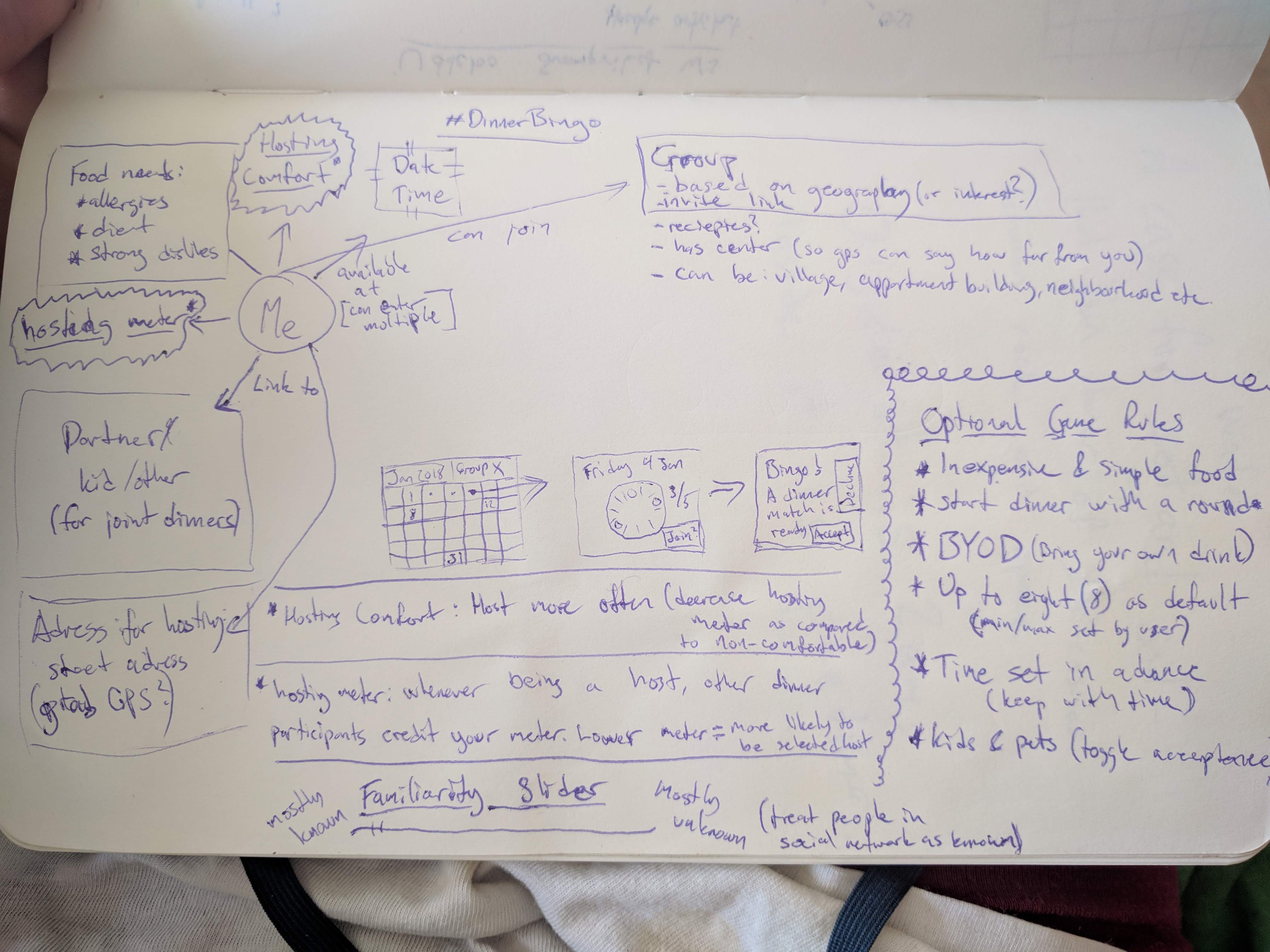 Functions: set_food_needs() - setting all food needs variables set_family() - declaring family to toggle at dates set_accepted_time() -setting what times dinners work, used to match/filter add/remove_recipie() - add recipie that is available in groups "recipiebooks" add/remove_dates() - adding a date when guest is available for hosting/joining dinner join/leave_group() - joining a group, groups are where guests are combined into dinners accept/decline_dinner_invite - when a match is made, guests are invited to a selected host and they can accept or decline cancel_dinner - if guest/host needs to cancel dinner. If host cancels, that could propt other dinner guests to be host, else cancel and notify all guests