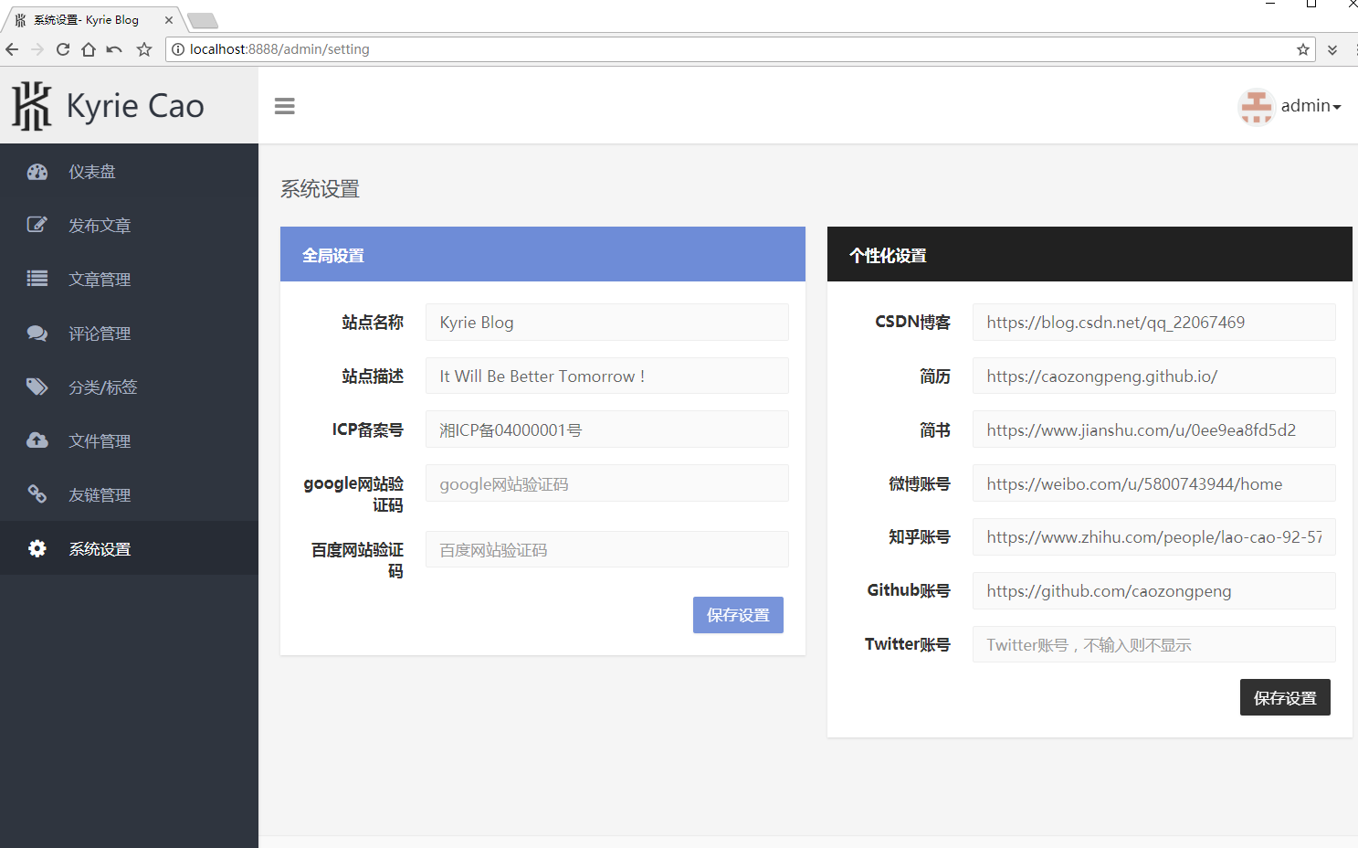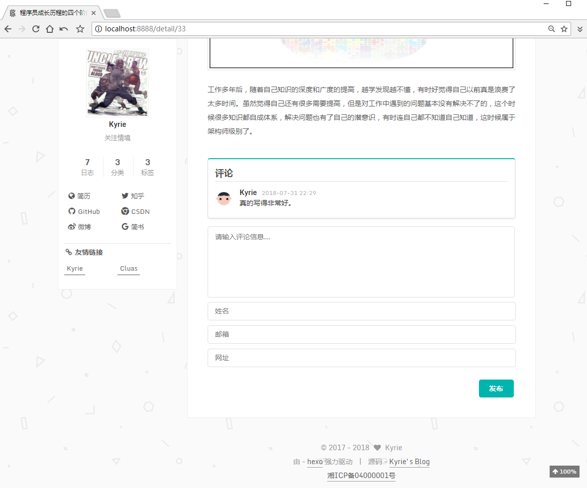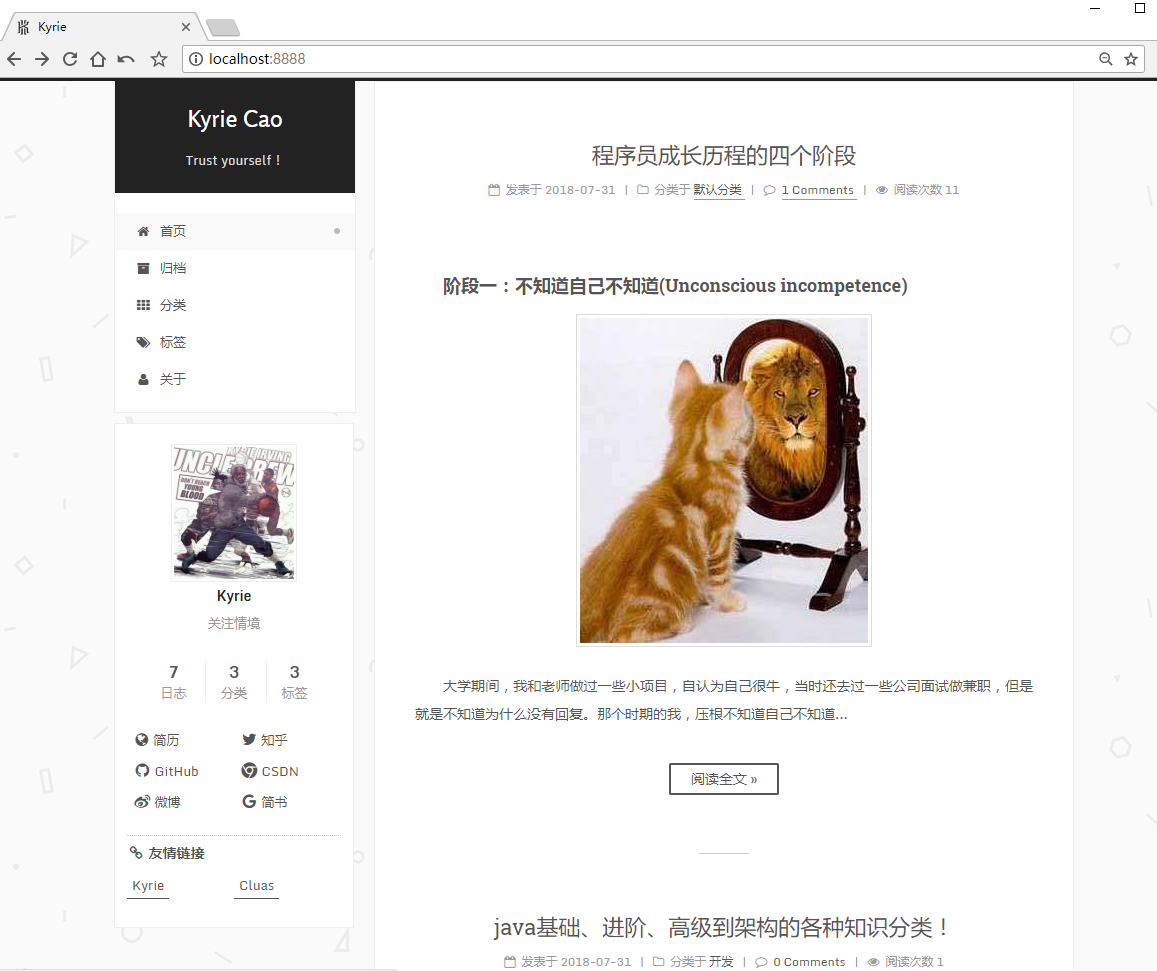 Kyrie Blog是由SpringBoot1.5 + MyBatis + Thymeleaf等技术实现的个人网站,如果觉得项目不错,请帮忙Star支持一下。